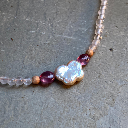Pearl Butterfly and Pink Sapphire, Rose Quartz gemstone Choker Necklace