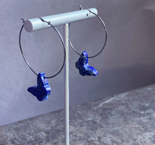 Oxidized Sterling silver hoops with Lapis Lazuli Gemstone butterflies