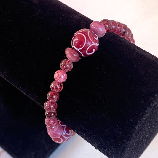 Red Jade, pink tourmaline, and strawberry Lepidocrocite gemstone stretch bracelet