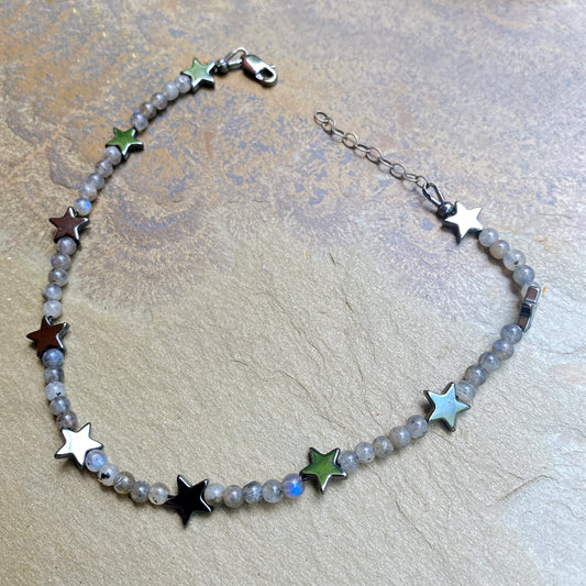 White labradorite and hematite gemstone star with oxidized sterling silver