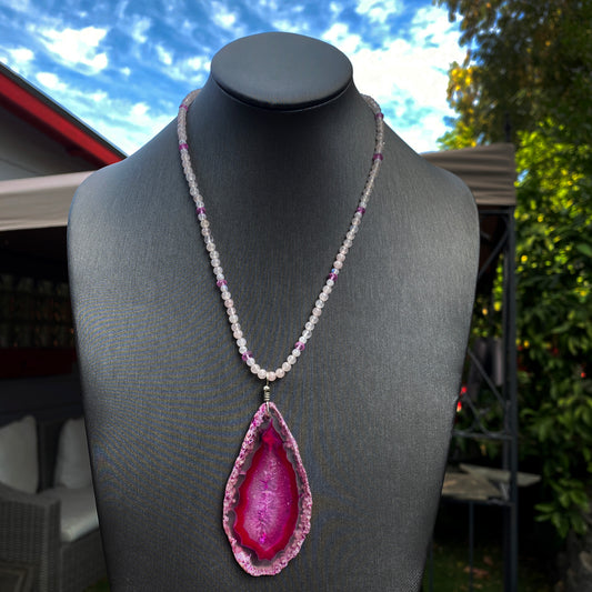 Women's Rose-Red Onyx Gemstone with Druzy Geode Agate pendant necklace
