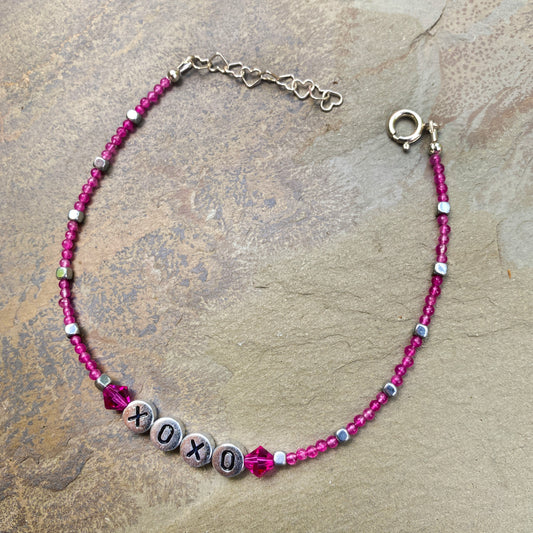 Pink agate, hematite, and Swarovski Crystal “xoxo” sterling silver anklet
