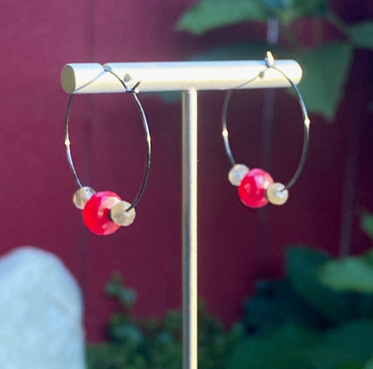 Pink chalcedony, labradorite, oxidized sterling sliver hoop earrings