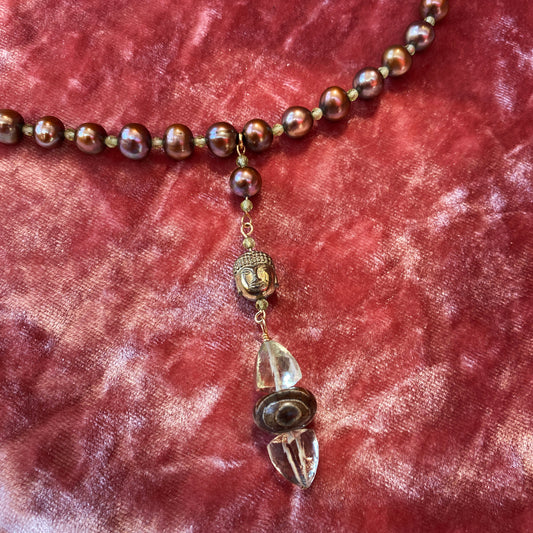 Freshwater pearl necklace with Peridot, Hematite Buddha, Amethyst & Tibetan Agate,