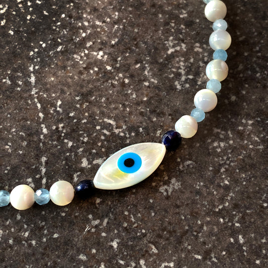 Women's mother of pearl, Blue Sapphire, and Aquamarine Evil Eye Gemstone silver Clasp Bracelet