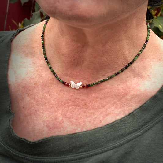 Women's Mother of Pearl Butterfly, Ruby and Ruby in Zoisite Gemstone choker necklace