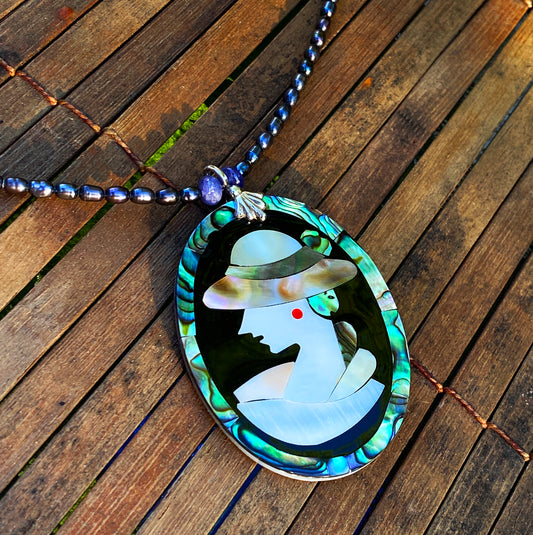 Mother of Pearl Cameo pendant, fresh water pearls & Tanzanite gemstone necklace