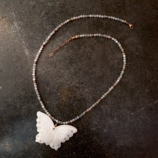 Women's Abalone Butterfly Pendant 14k Gold wire wrapped on beaded Morganite necklace
