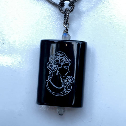 Oxidized Sterling Silver Chain with painted Onyx Cameo with Labradorite Gemstone Pendant necklace