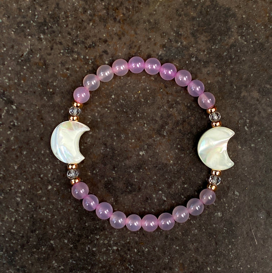Double mother of pearl Moons, pink Agates, white Topaz Gemstone stretch bracelet