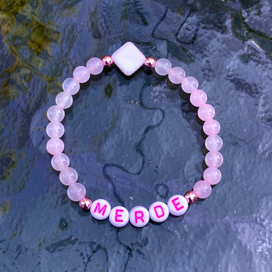 Women’s “merde” curse bracelet pink agate, rose hematite, and mother of pearl