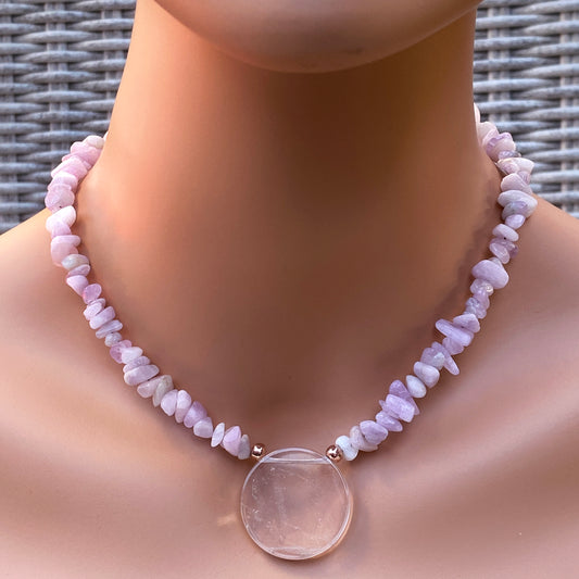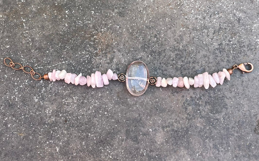Pink Angelite and Pink Tourmaline gemstone and copper Moon pendant necklace