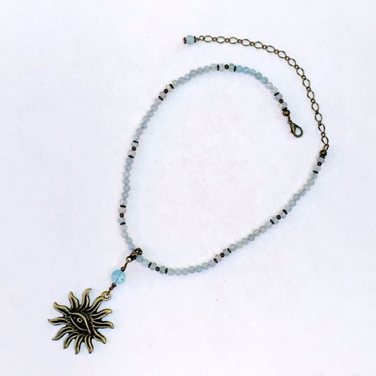 Aquamarine gemstone with Brass Evileye Sun pendant Necklace