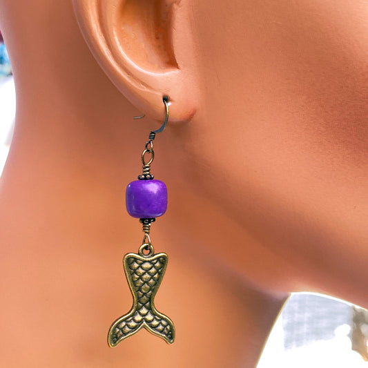 Brass Mermaid Tail and phosphosiderite gemstone Dangle Drop Earrings