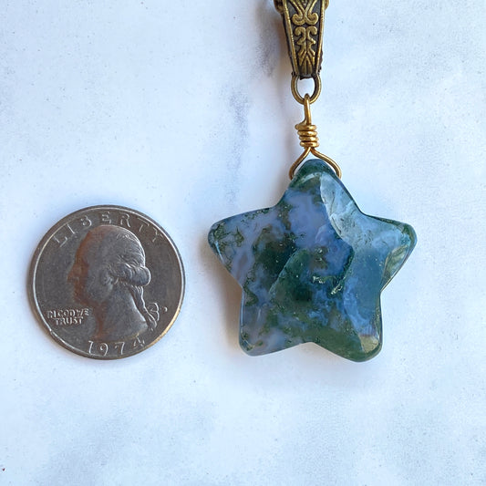 Moss Agate gemstone Star Pendant on Bronze chain
