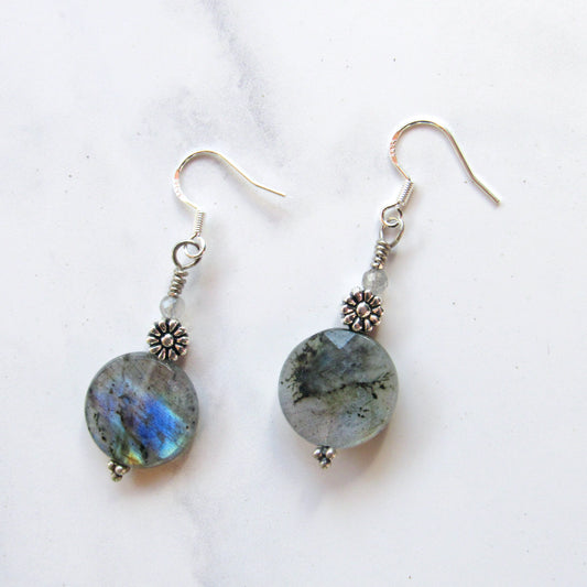 Labradorite gemstone and Sterling Silver Flower Dangle Earrings