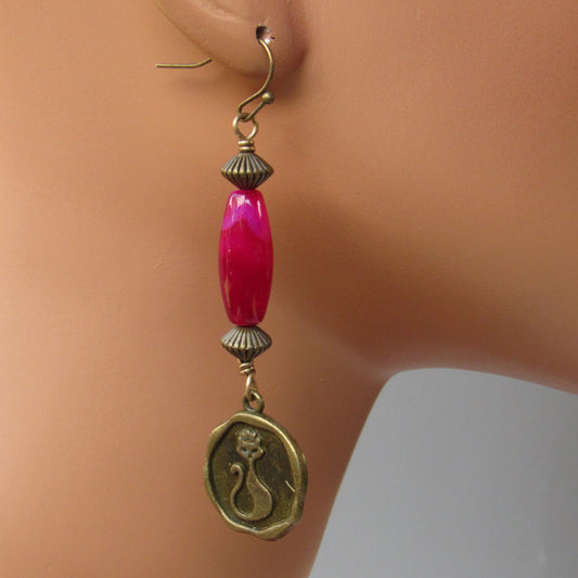 Pink Agate gemstone and Brass Kitty Cat Drop Earrings