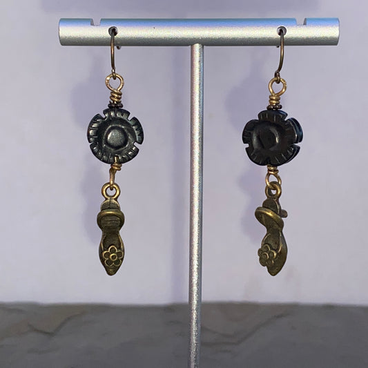 Brass shoe and onyx flower drop earrings