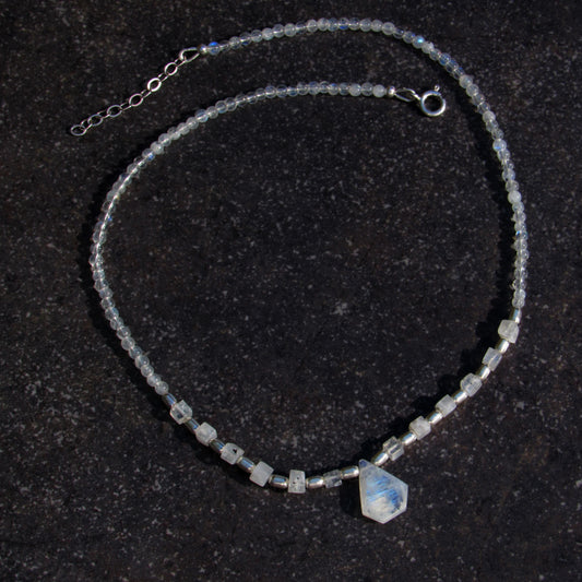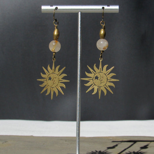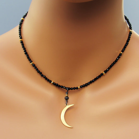 Black onyx, gold vermeil over sterling silver Moon and beads. Black non conflict diamond
