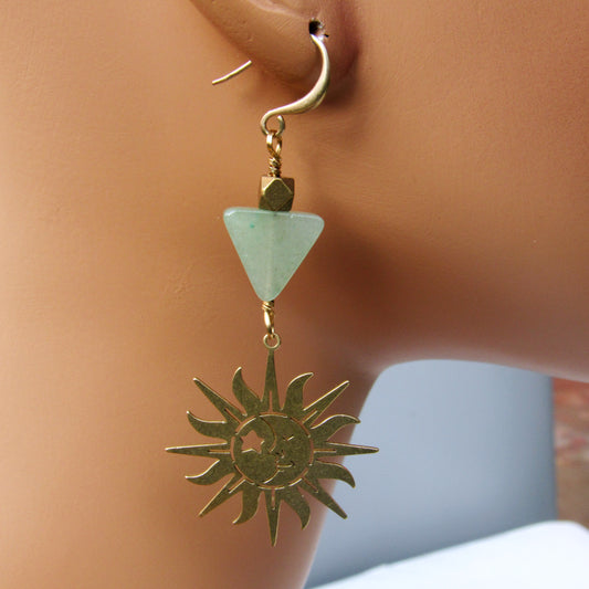 Brass Sun and Green Aventurine gemstone Drop Earrings