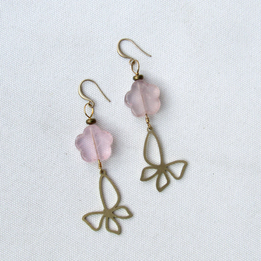 Rose Quartz gemstone Flowered Brass Butterfly Drop Earrings