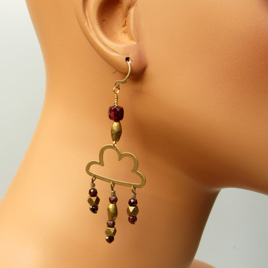 Raw Brass Cloud and Garnet gemstone Rain Drop Earrings