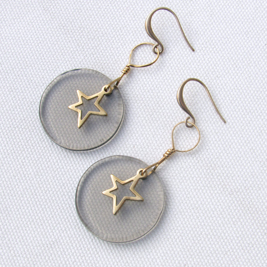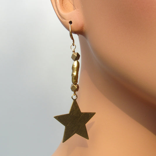 Brass Star and Green Pearl Drop Earrings