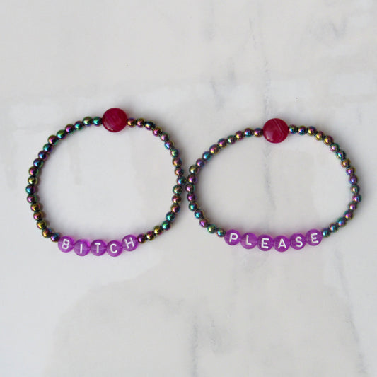 Hematite and Onyx gemstone “BITCH PLEASE” Stretch Bracelets