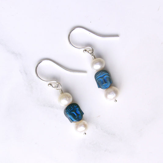 Genuine Freshwater Peals, Hematite gemstone Buddhas, and Sterling Silver Drop Earrings