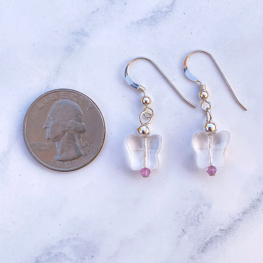 Clear Quartz Butterflies with Pink Sapphires and Sterling Silver Drop Earrings