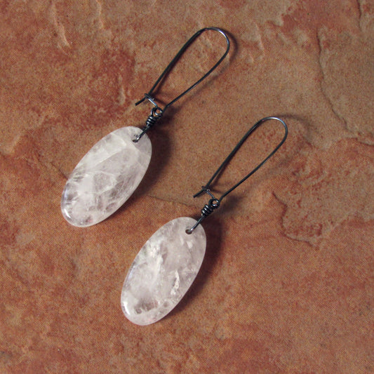 Light Rose Quartz and Hand Wrapped Oxidized Sterling Silver Drop Earrings