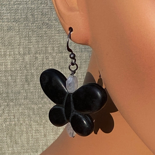 Howlite Butterflies, Blue Flashy Moonstones, Oxidized Sterling Silver Earrings