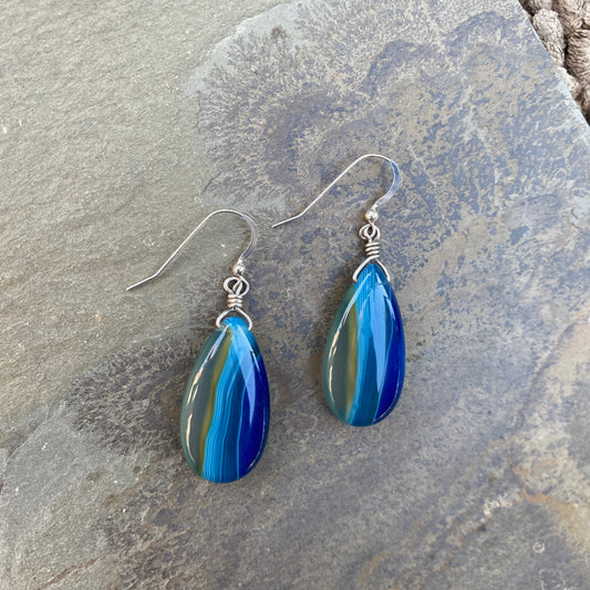 Blue Onyx Agate Tear Drop Shape and Sterling Silver Earrings