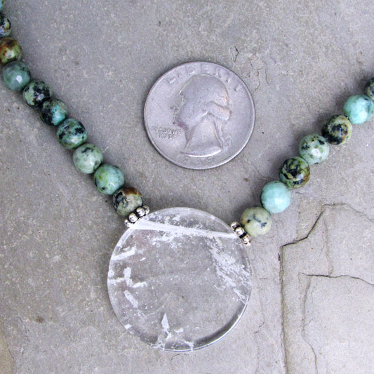 African Turquoise Gemstones with Clear Quartz Disk Pendant and Sterling Silver