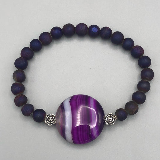 Purple Banded Agate Gemstone, Sterling Silver, Druzy Agate, women’s Stretch Bracelet