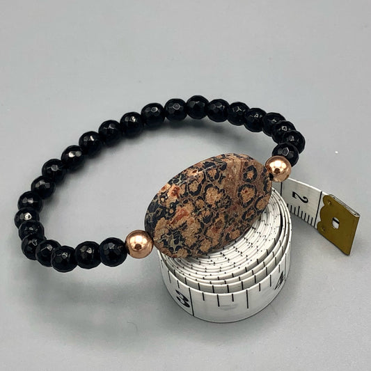 Leopard Print Jasper Gemstone , Faceted Black Onyx, and 14 Kt Gf Women’s Stretch Bracelet