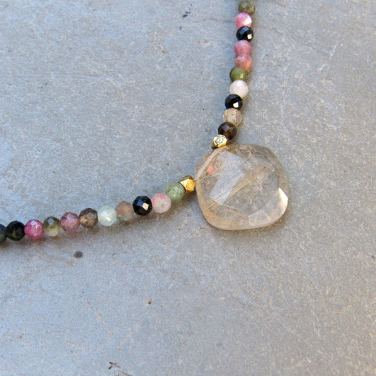 Rutilated Gold Gemstone Pendant with Mixed Tourmaline and14 kt gf Necklace