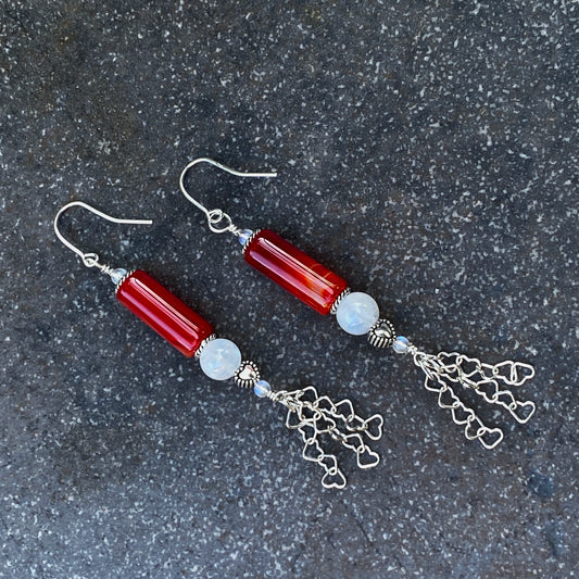 Red Agate Gemstone, Moonstones, Sterling Silver Drop Earrings