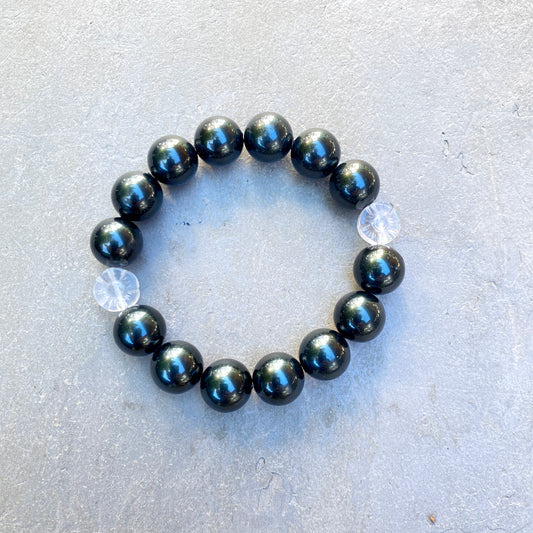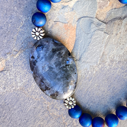 Blue Flame Larvikite and Druzy Agate Gemstone with Sterling Silver Bracelet