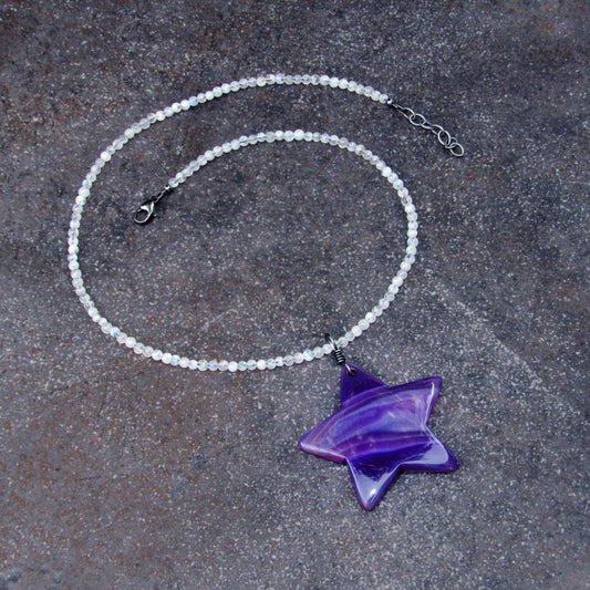 Purple Onyx Agate Star on Moonstone Beaded Necklace with Oxidized Sterling Silver