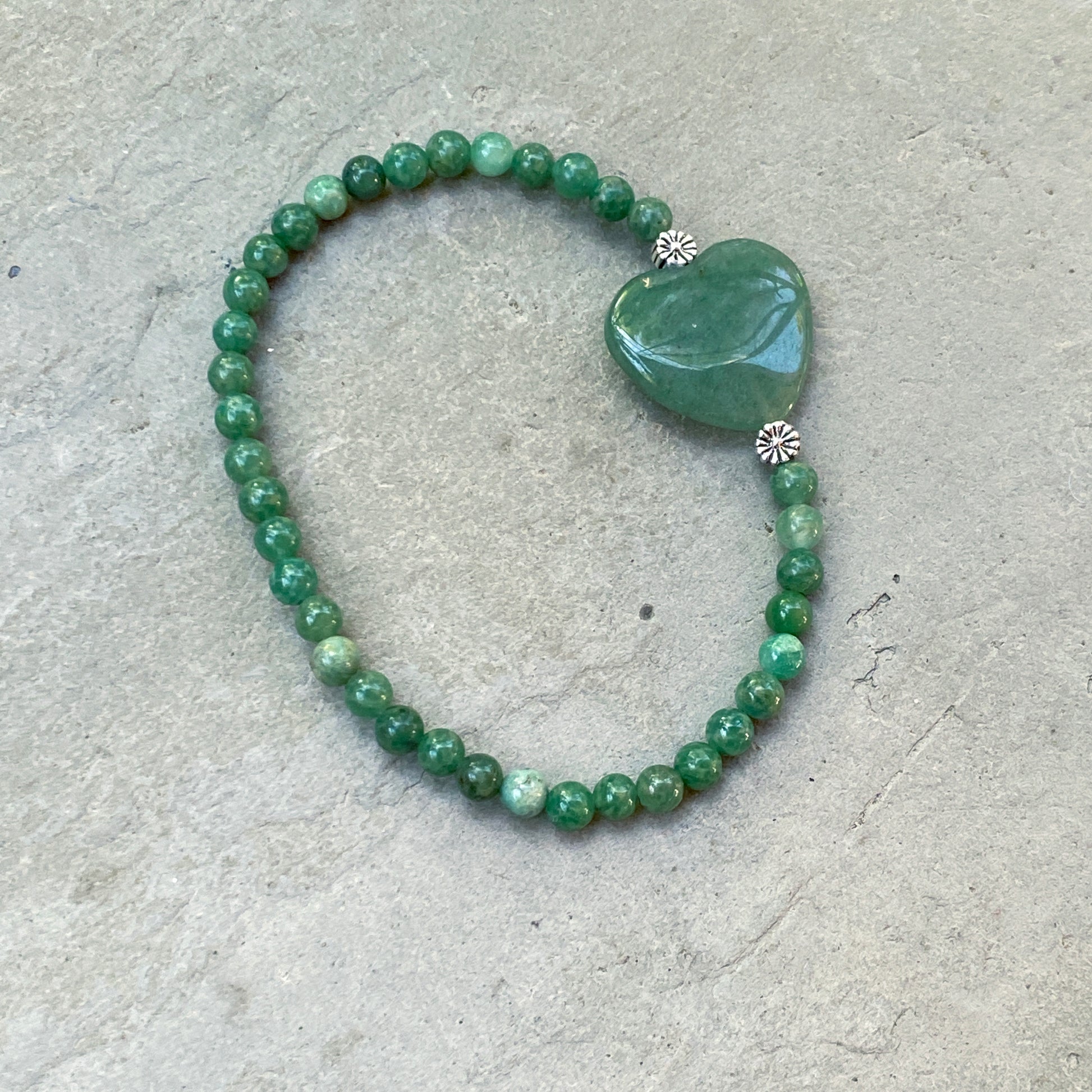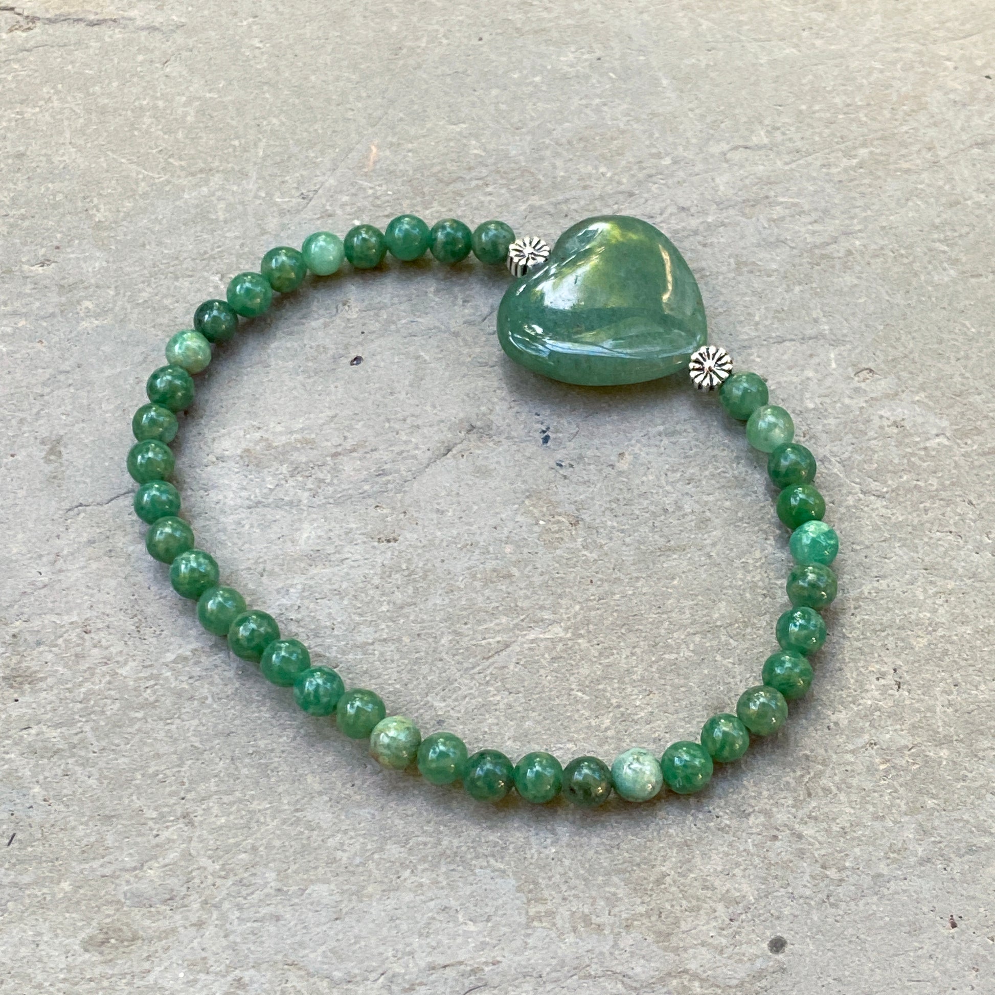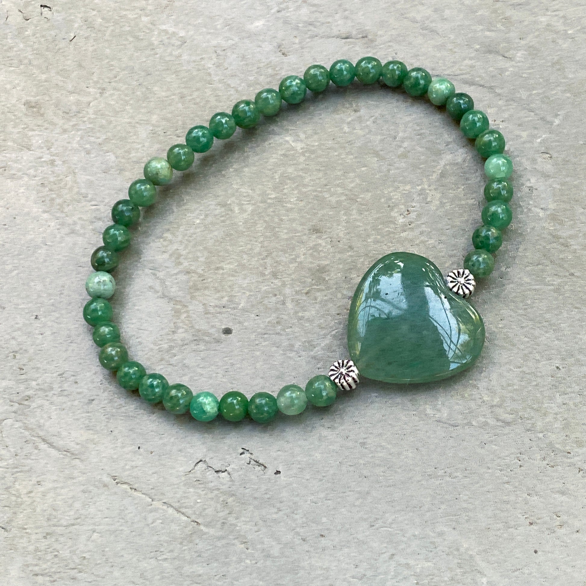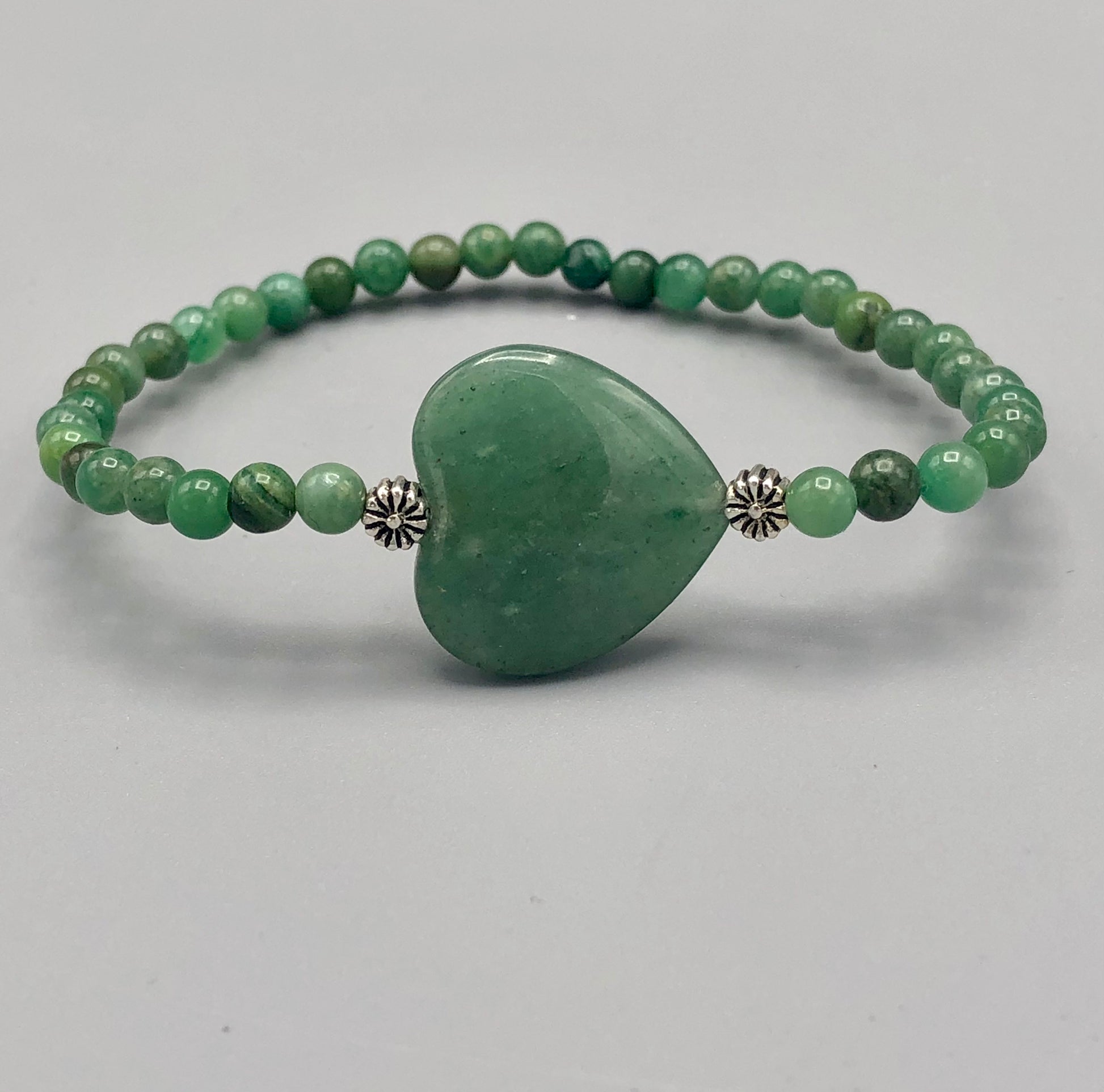 Aventurine Heart, Sterling Silver, and Green African Jade Women’s 7 inch Stretch Bracelet