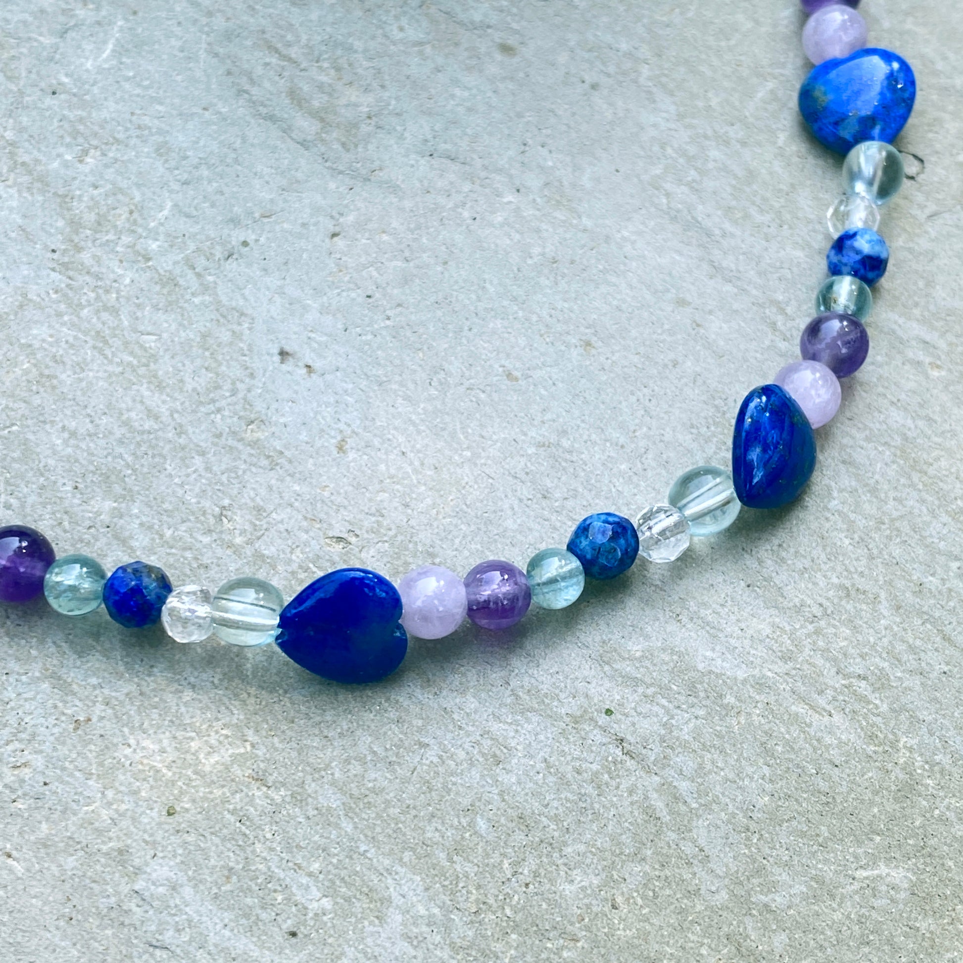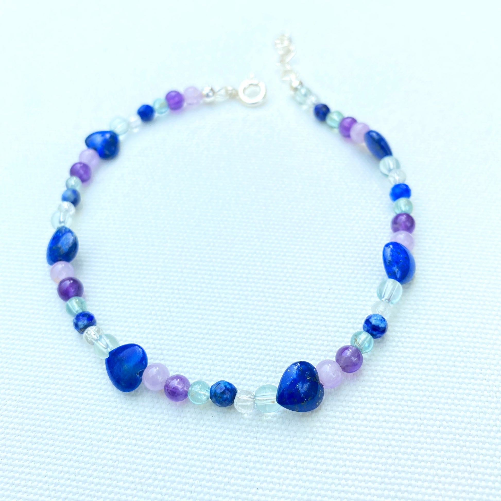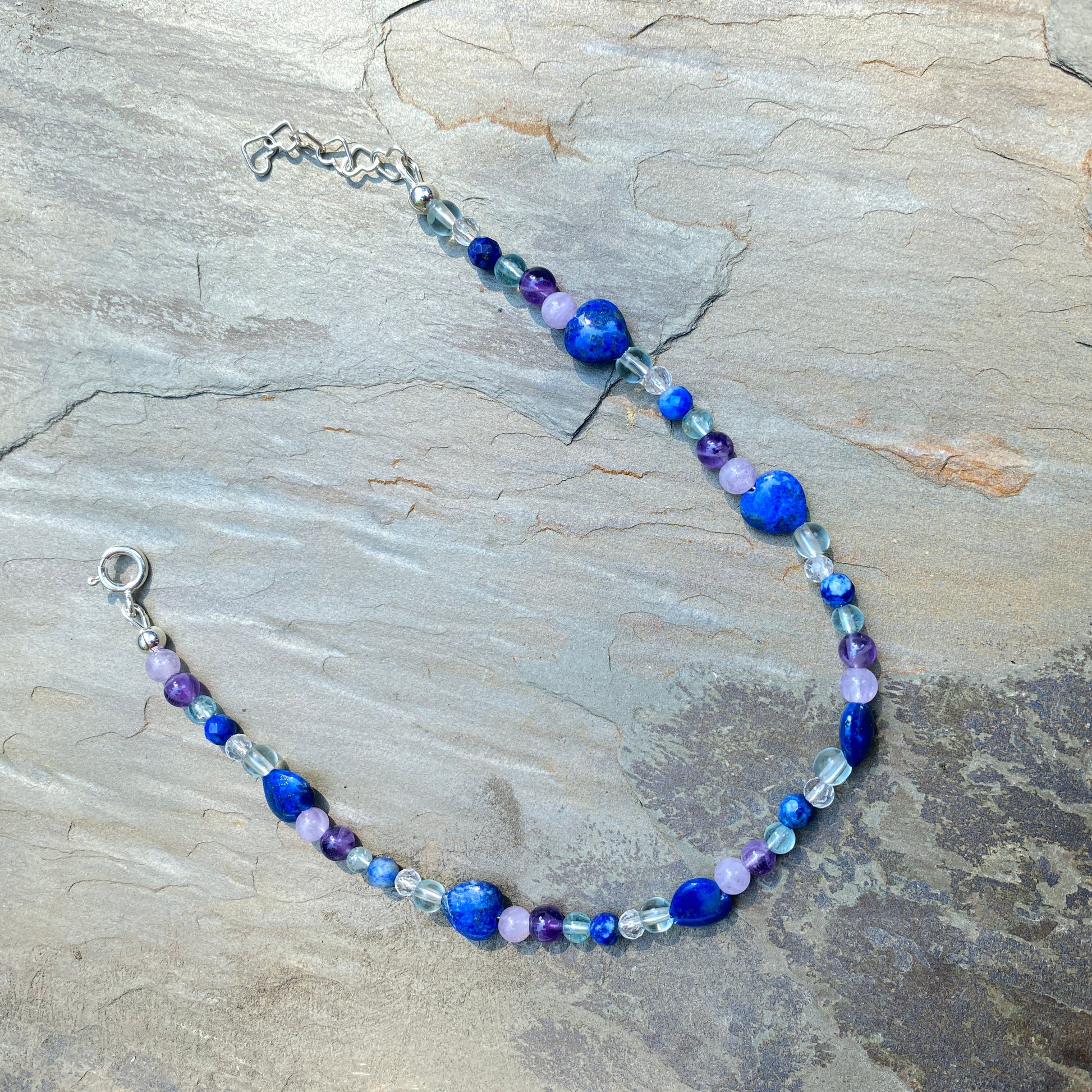 Beautiful Lapis Lazuli heart, clear quartz, fluorite, amethyst, sterling silver anklet