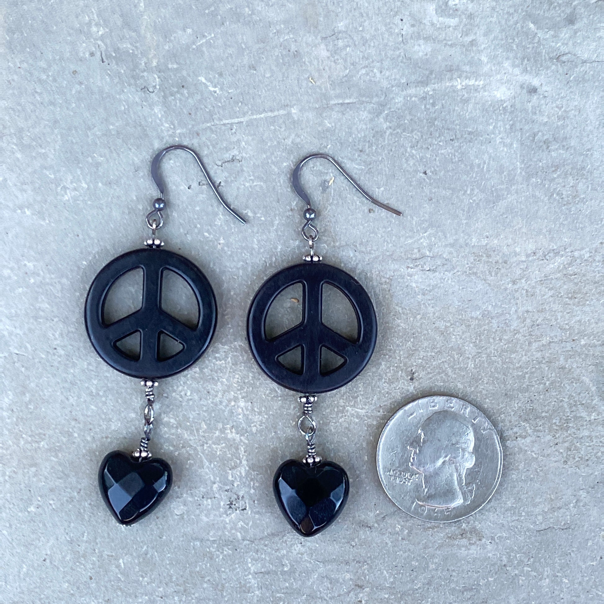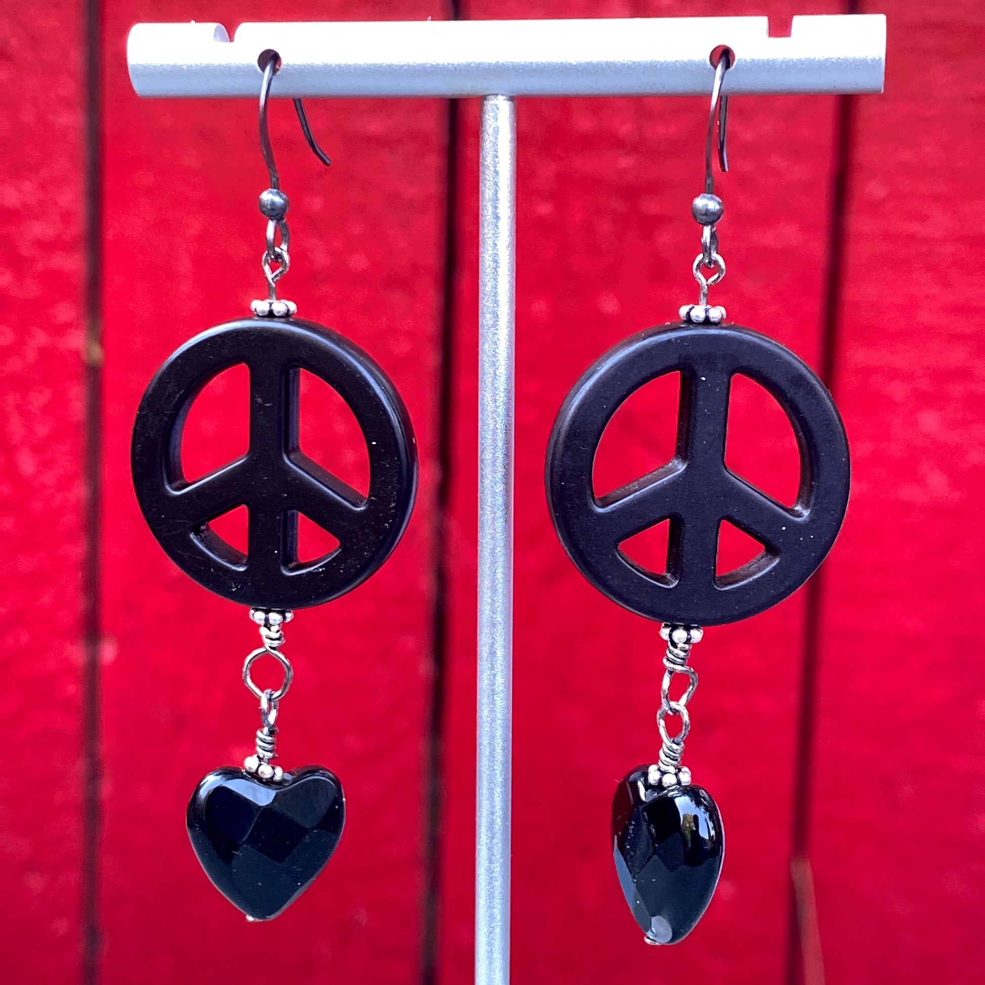 Black Onyx Faceted Hearts w/ Howlite Peace Signs and Sterling Silver Drop Earrings