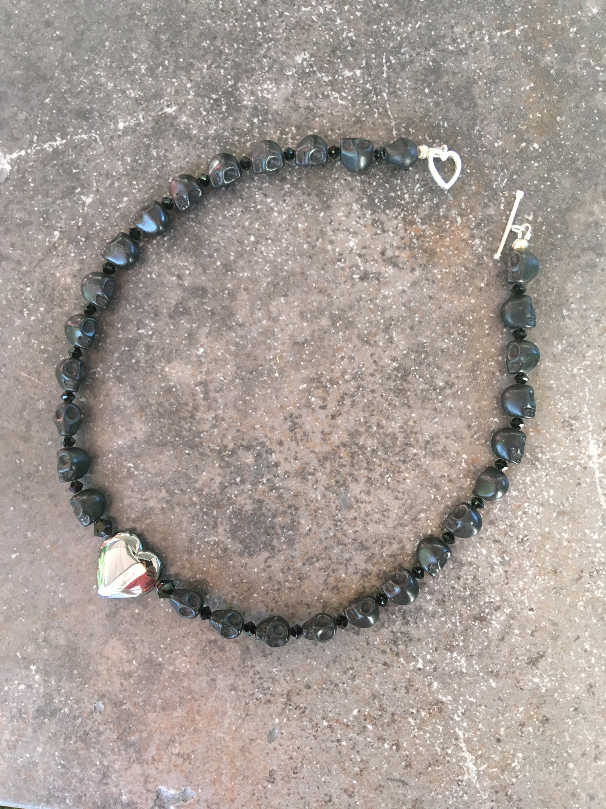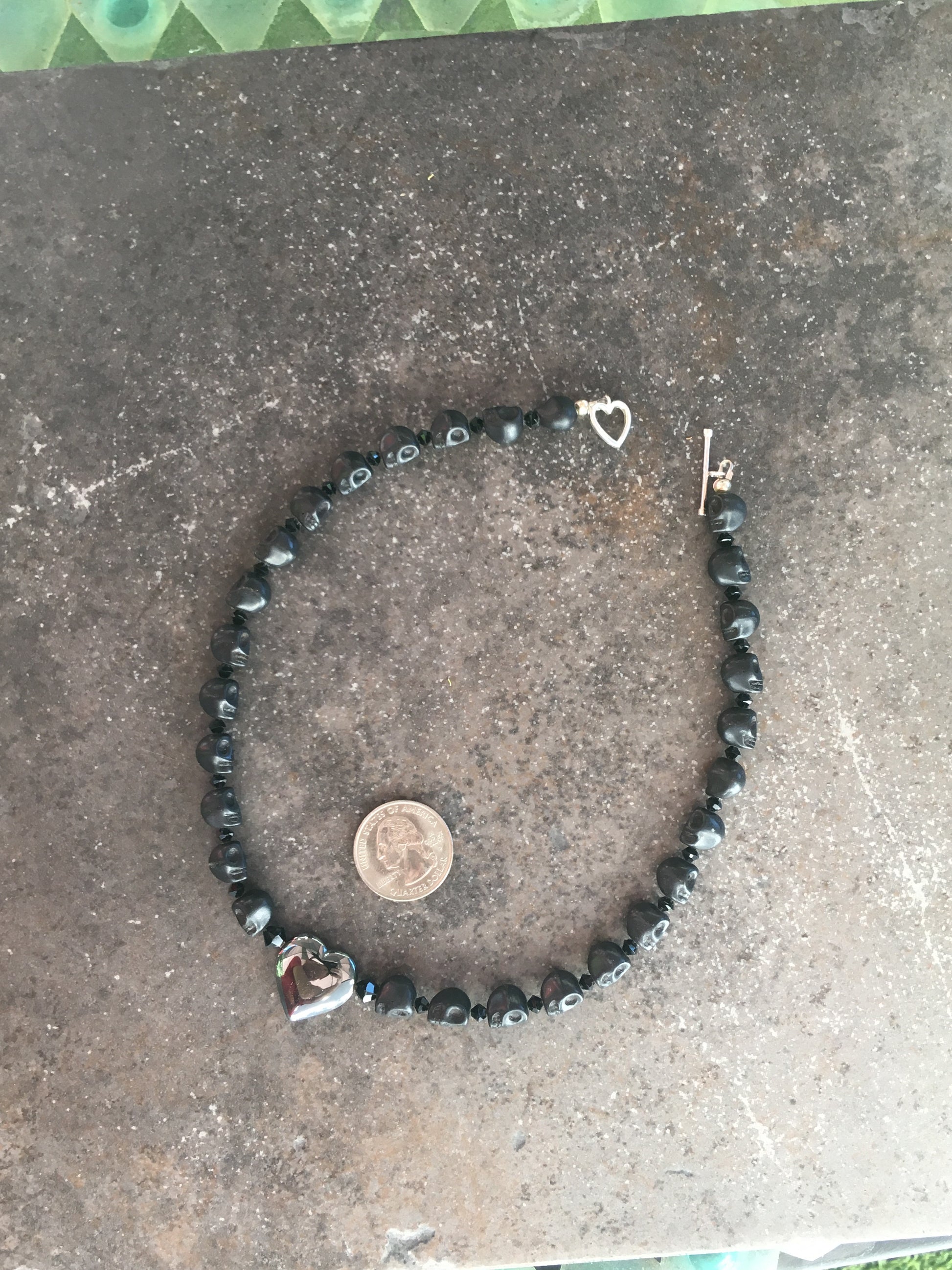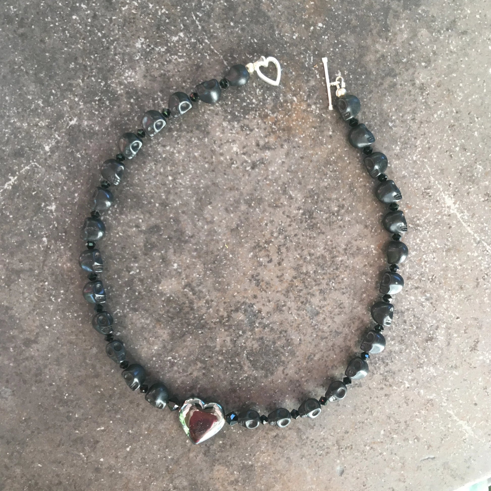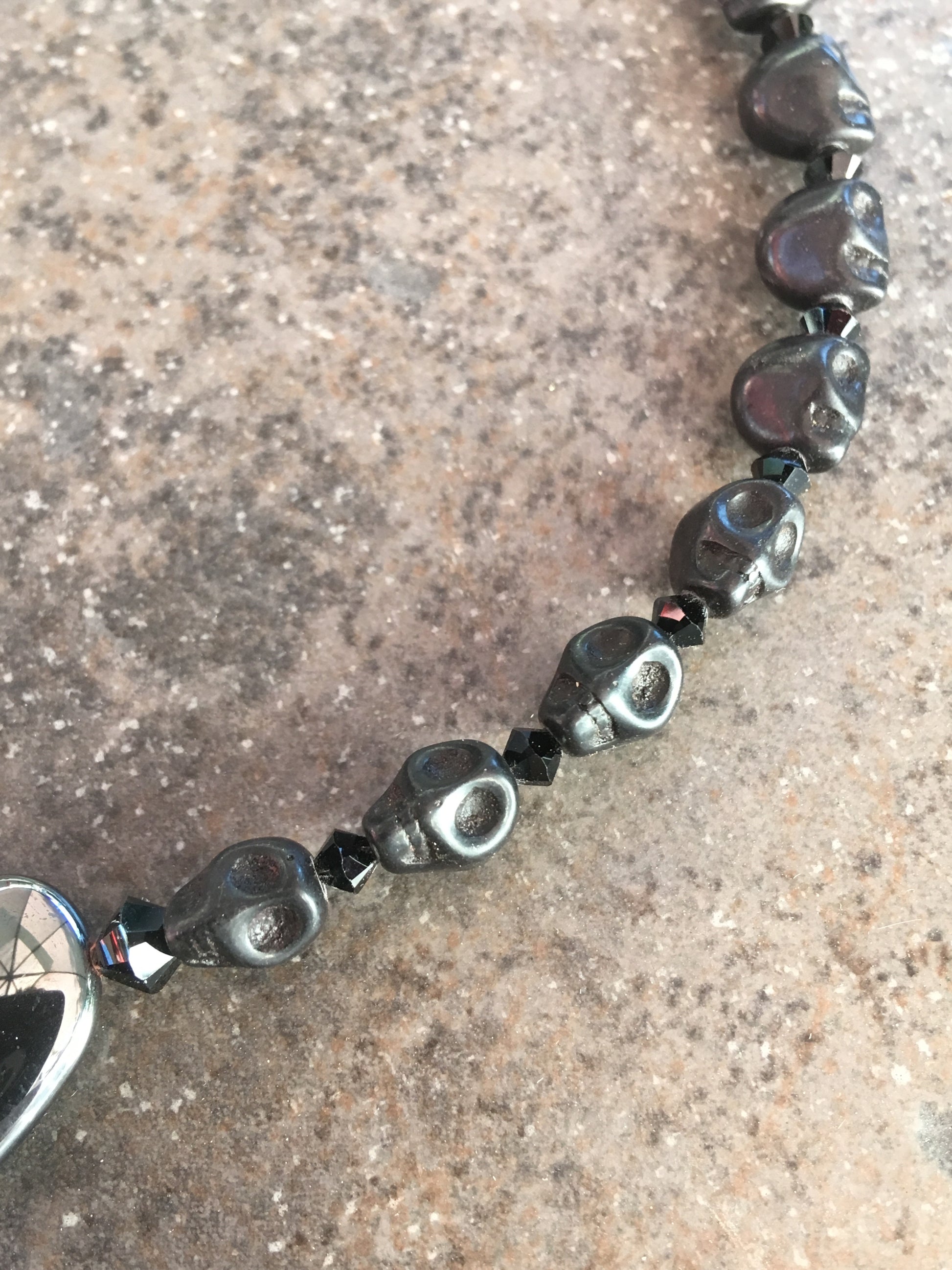 Black Skull & Crystal with Hematite gemstone heart Necklace