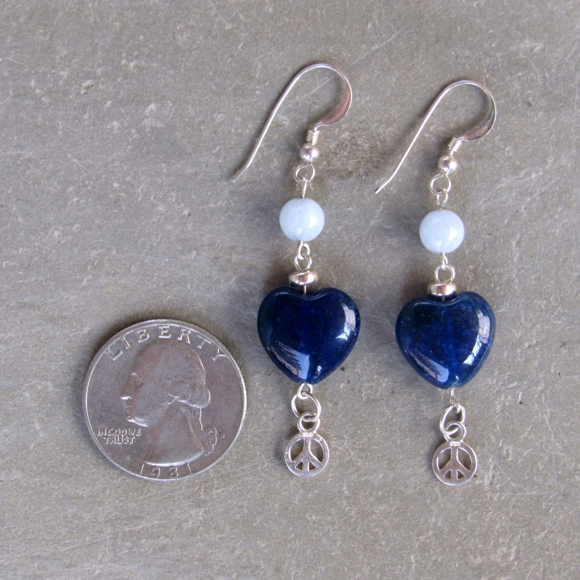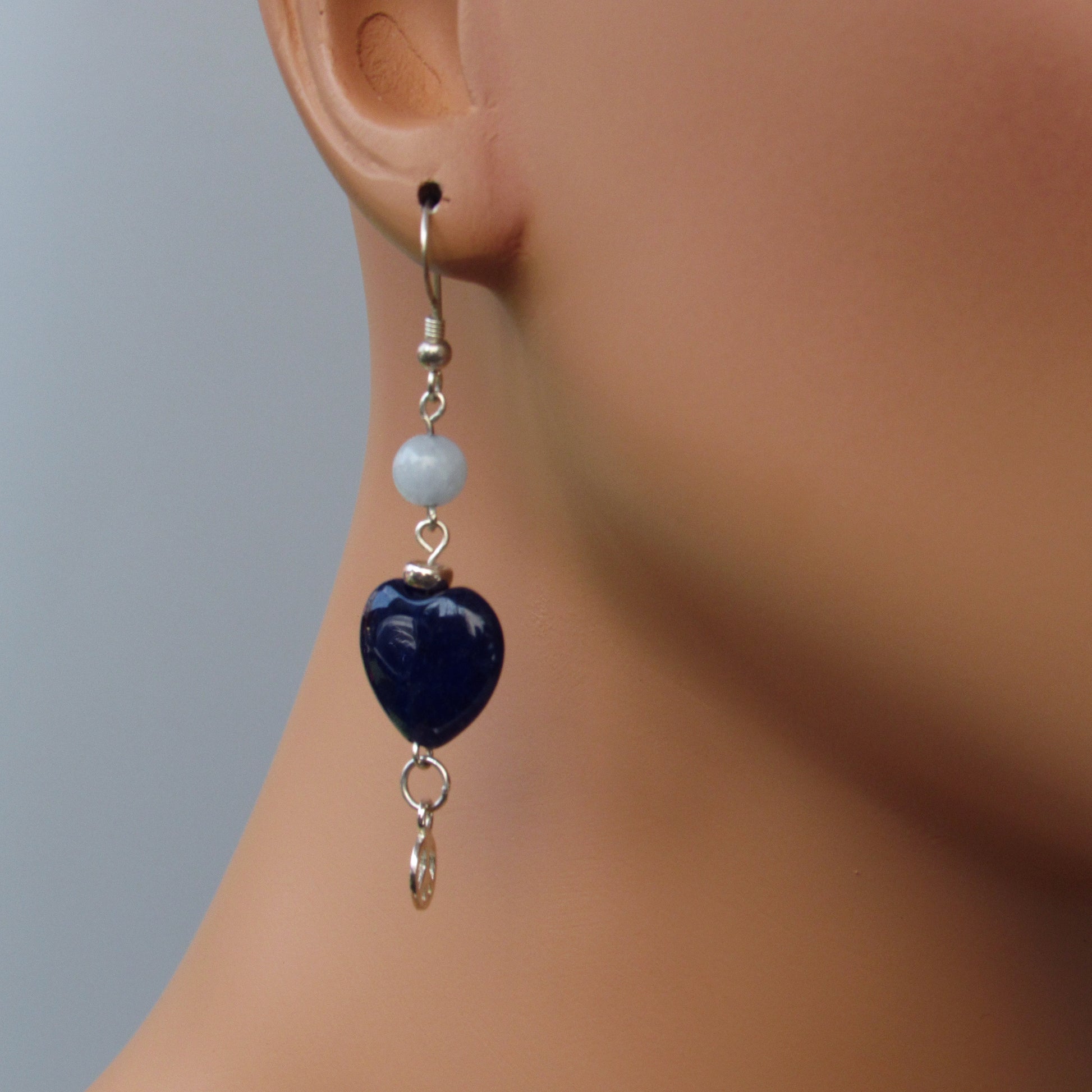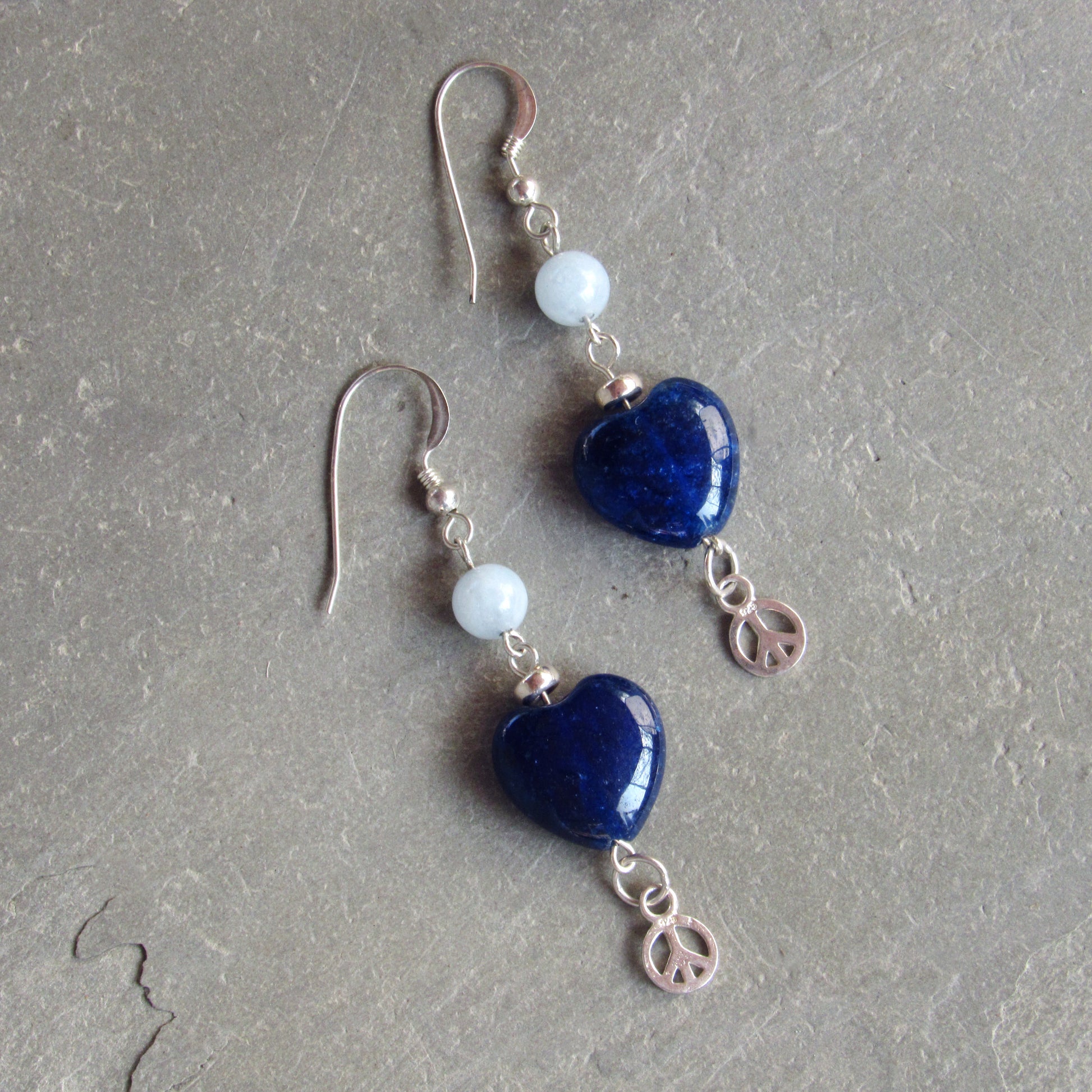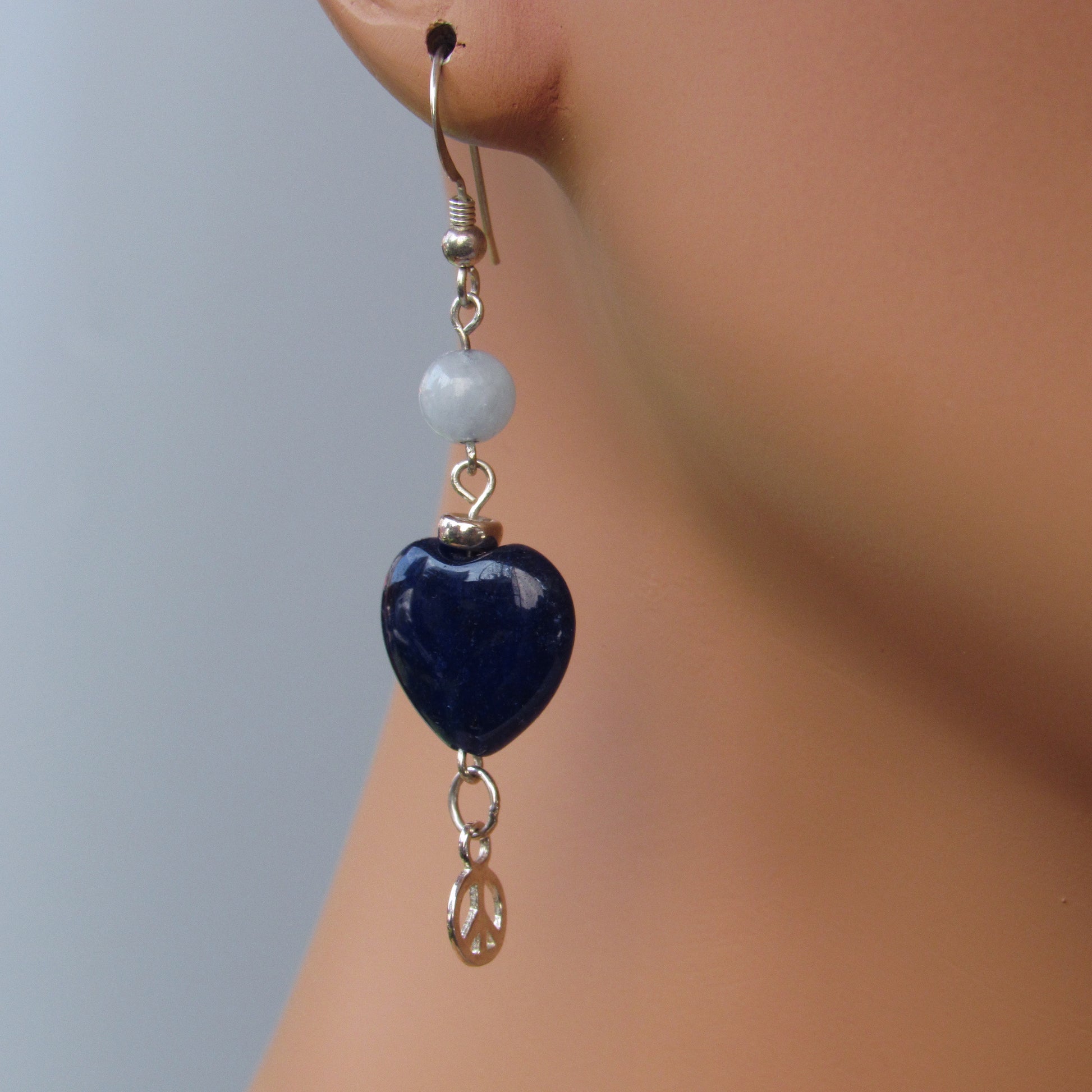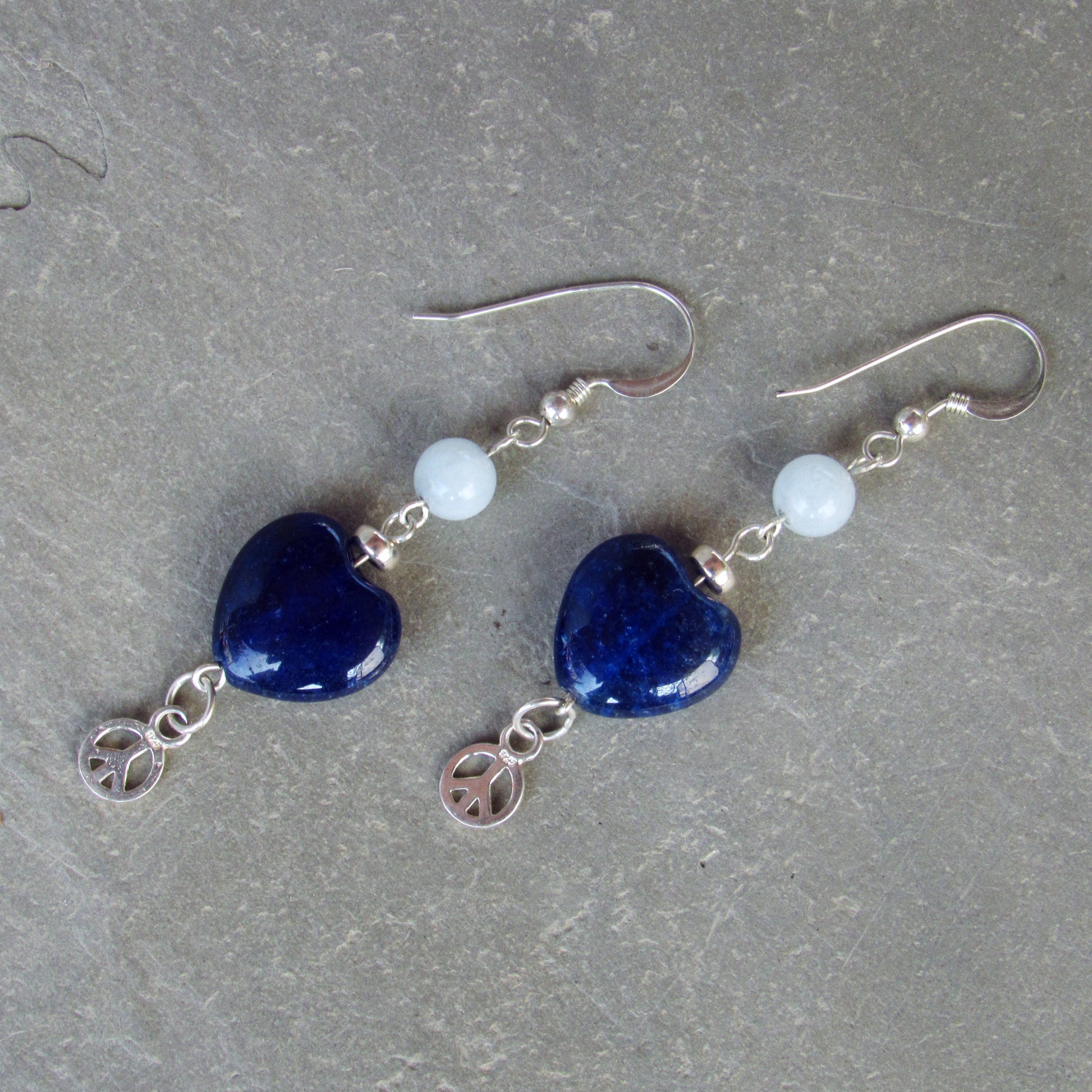 Blue Agate gemstone Hearts, Sterling Silver Peace Signs, Aquamarine, Sterling Silver Drop Earrings