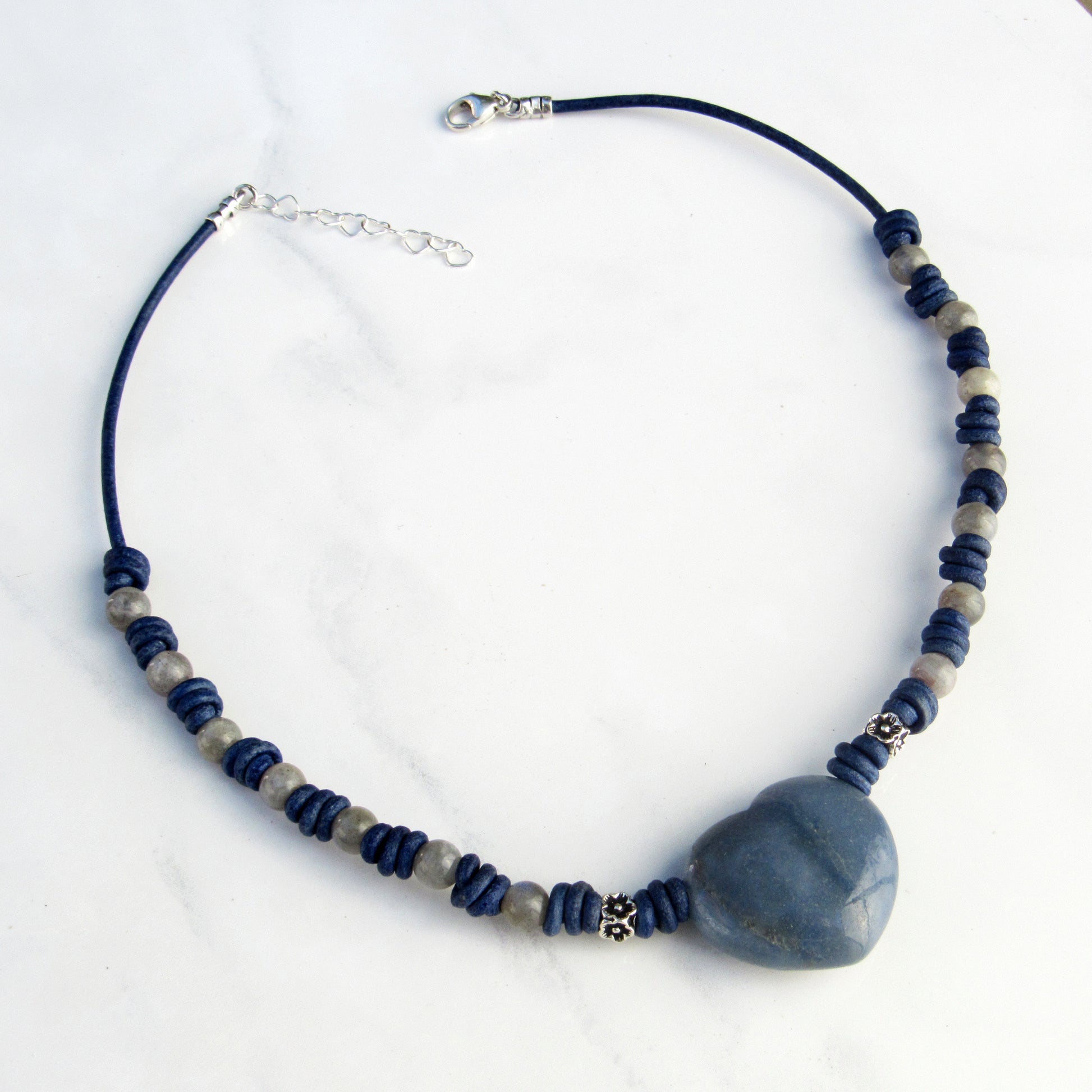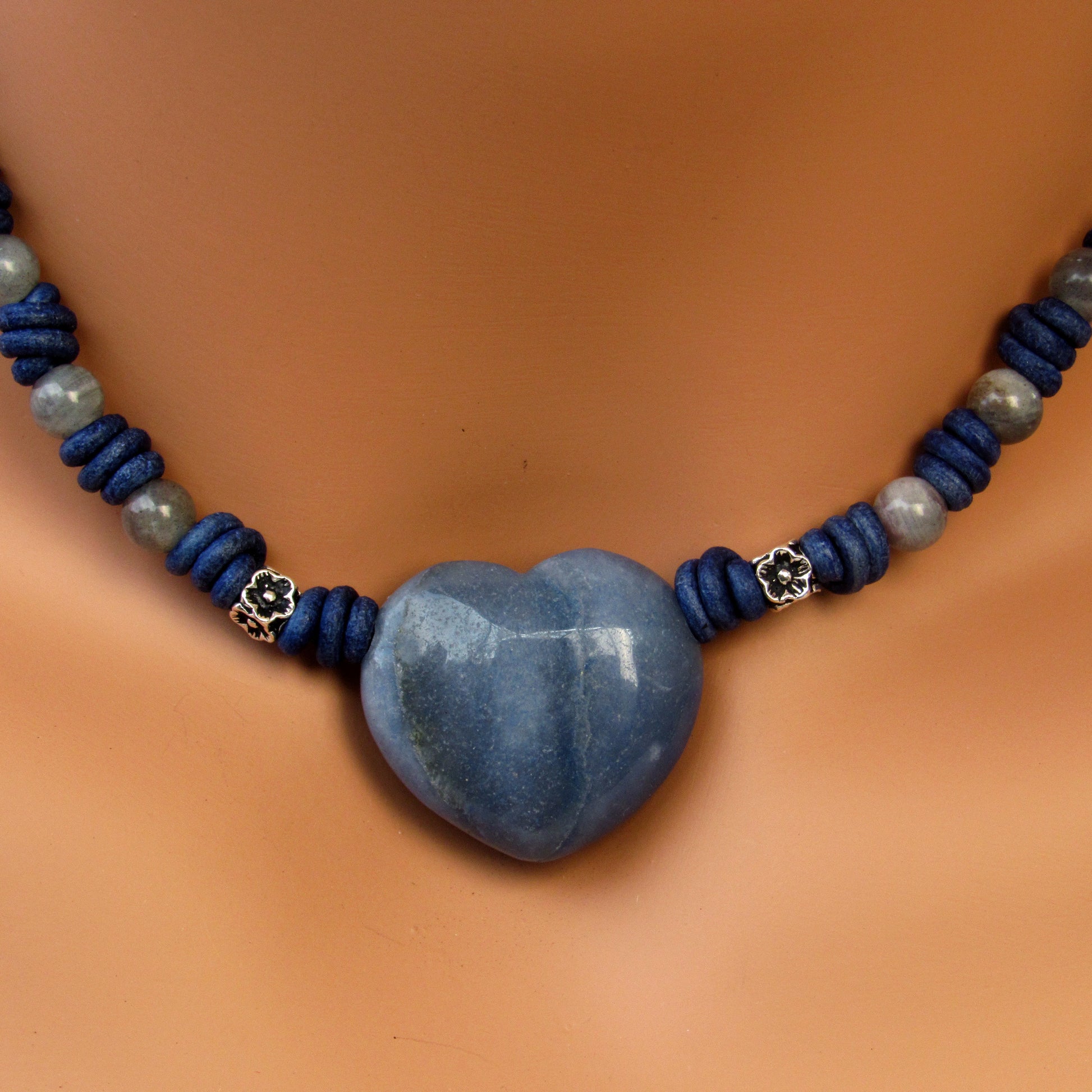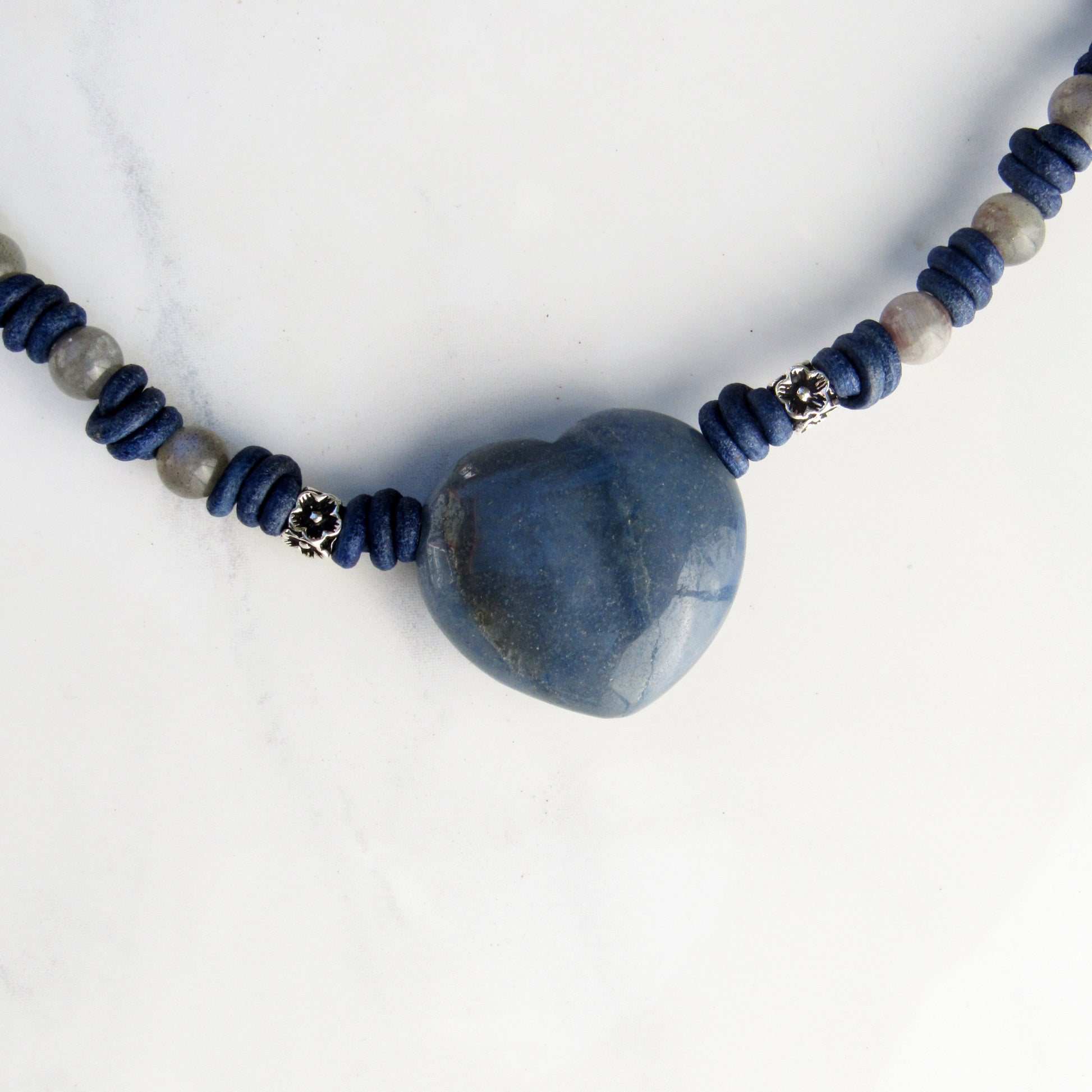Blue Aventurine gemstone Heart, Labradorite, and Sterling Silver Leather Choker