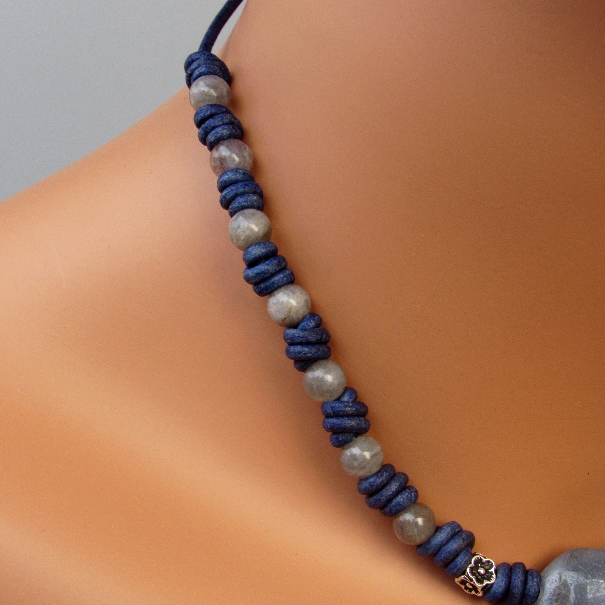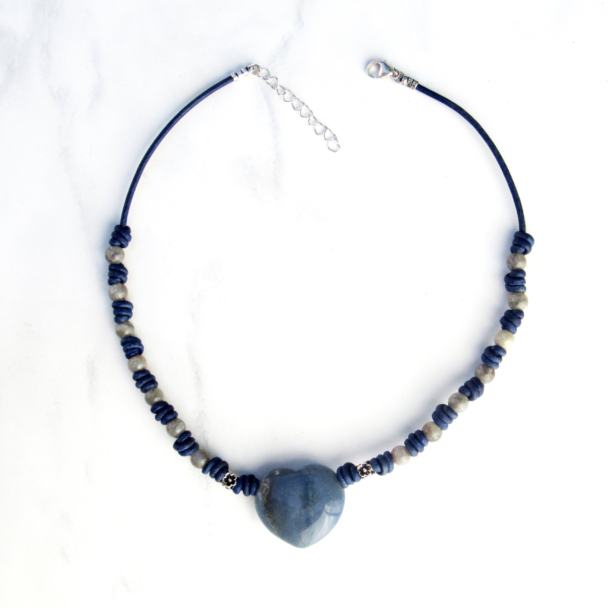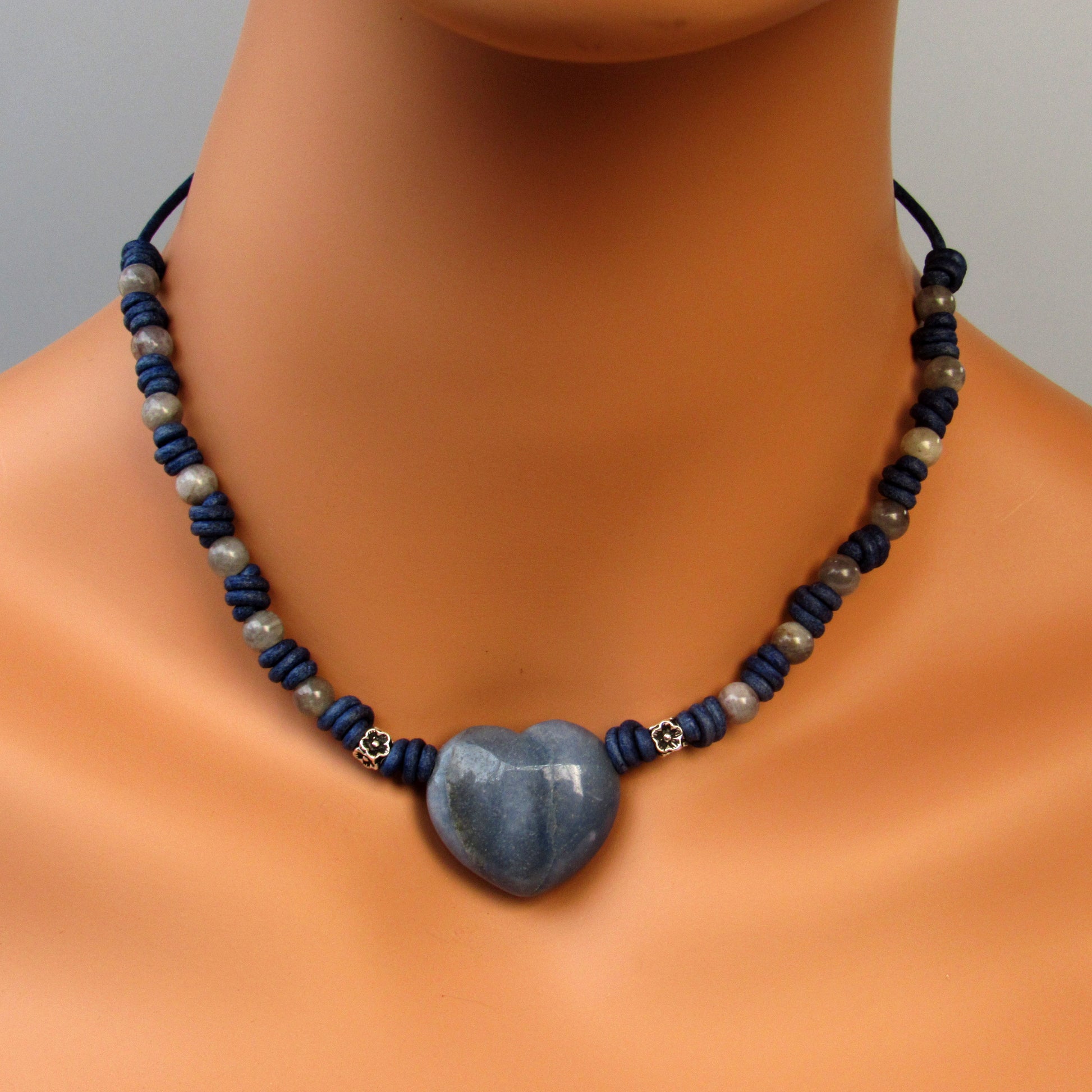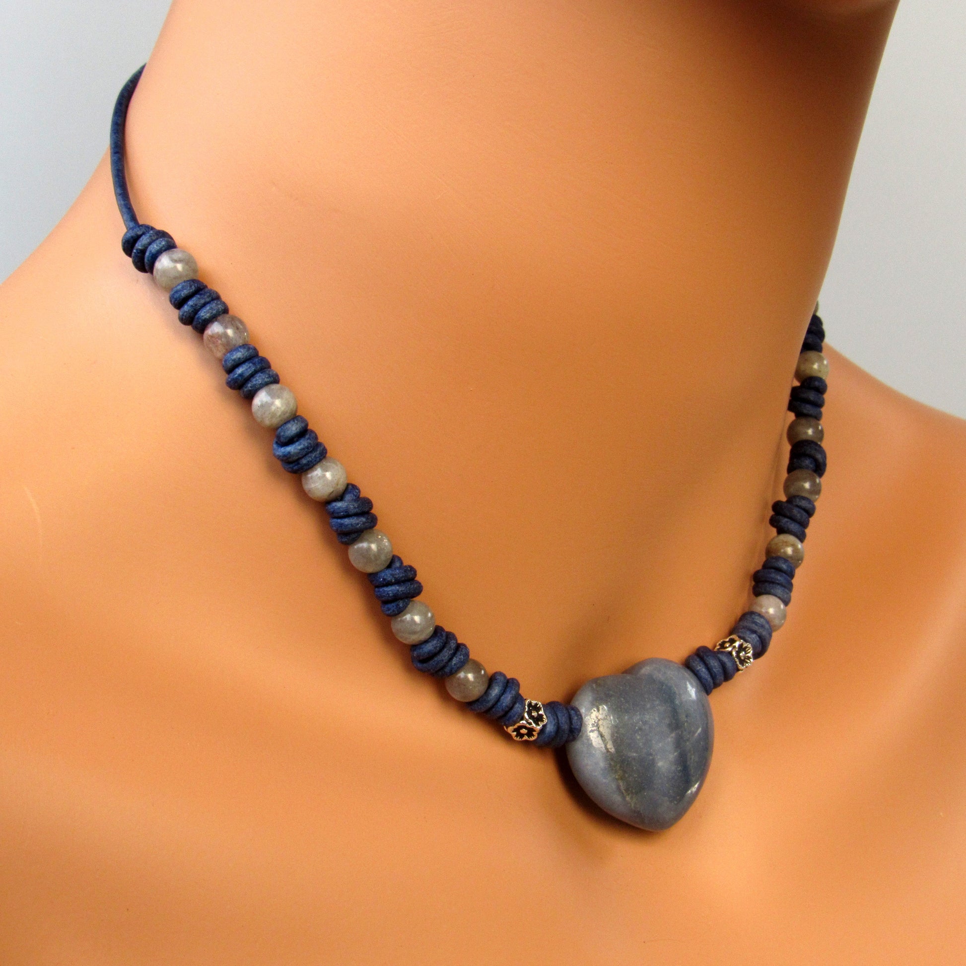 Blue Aventurine gemstone Heart, Labradorite, and Sterling Silver Leather Choker