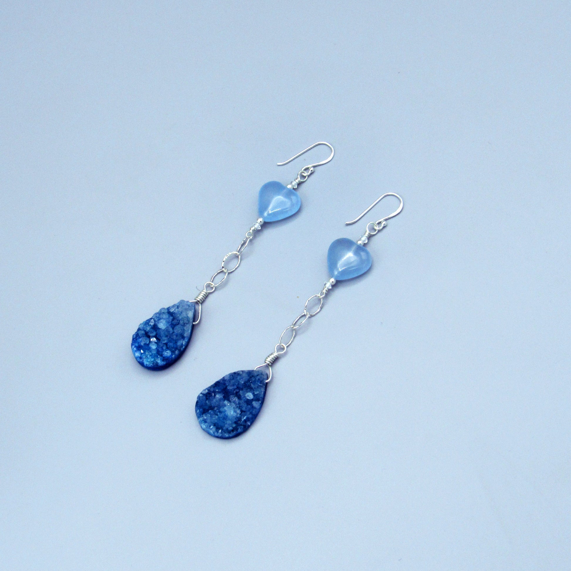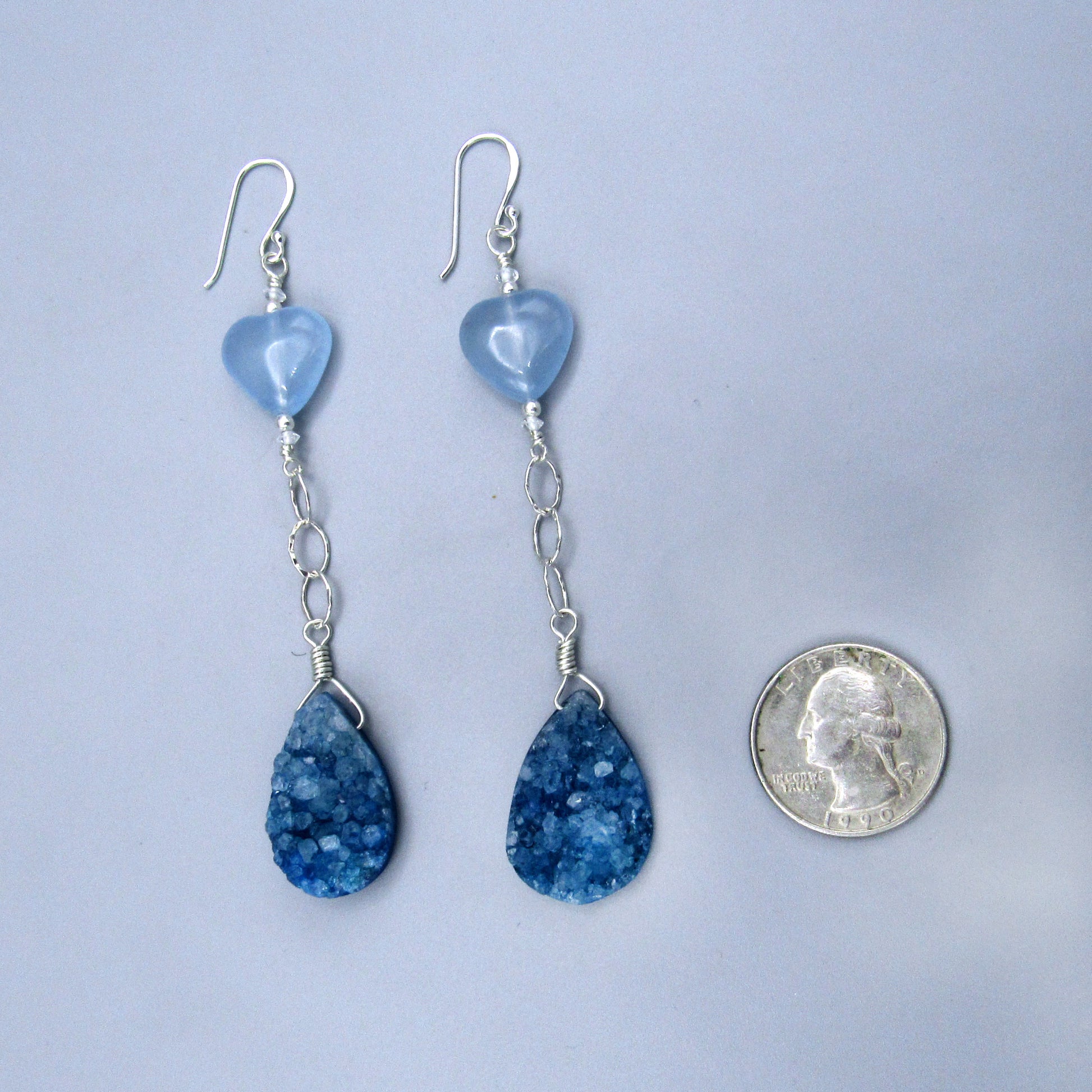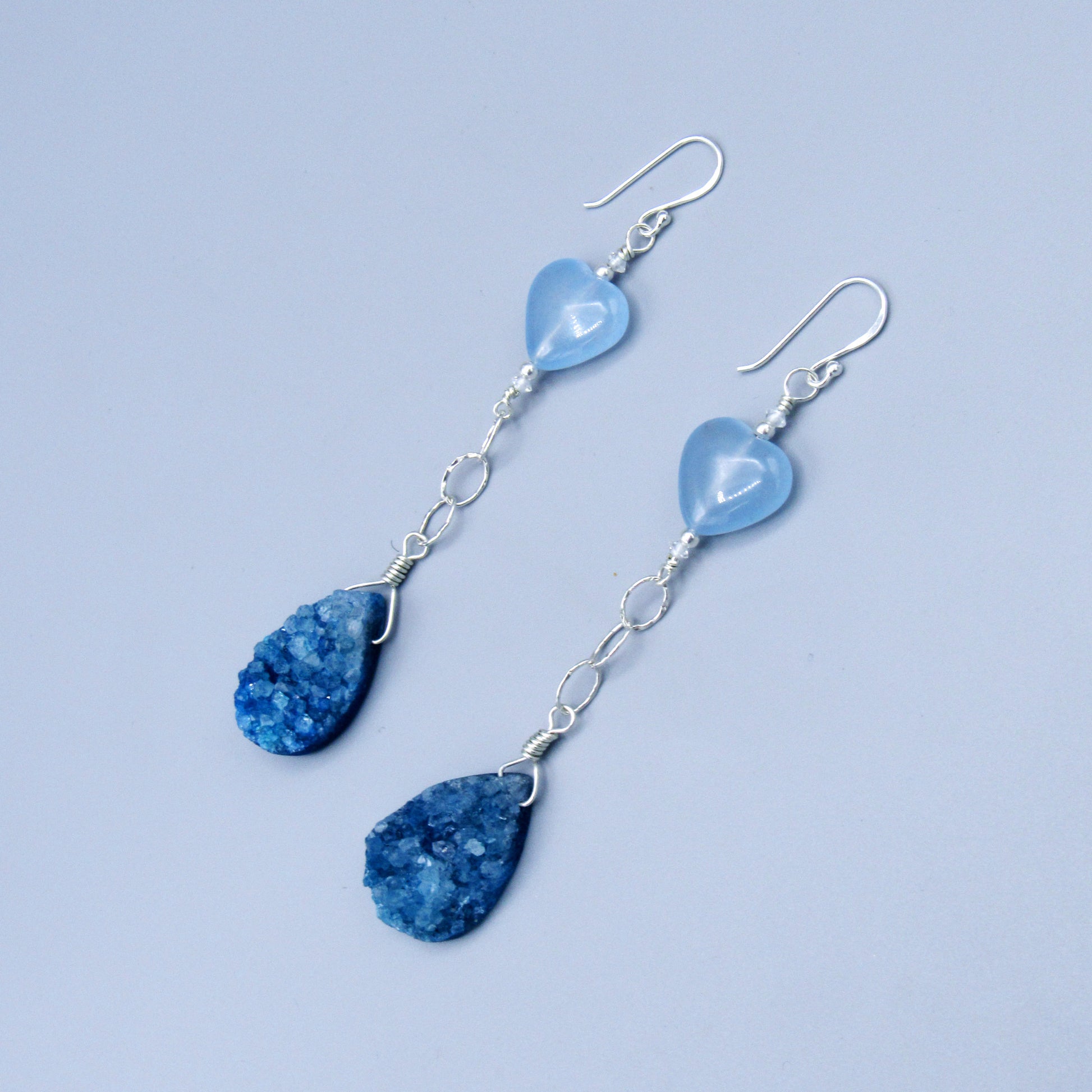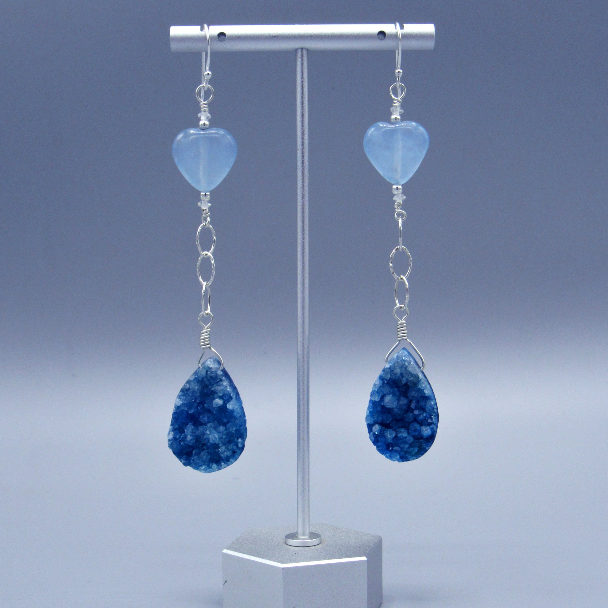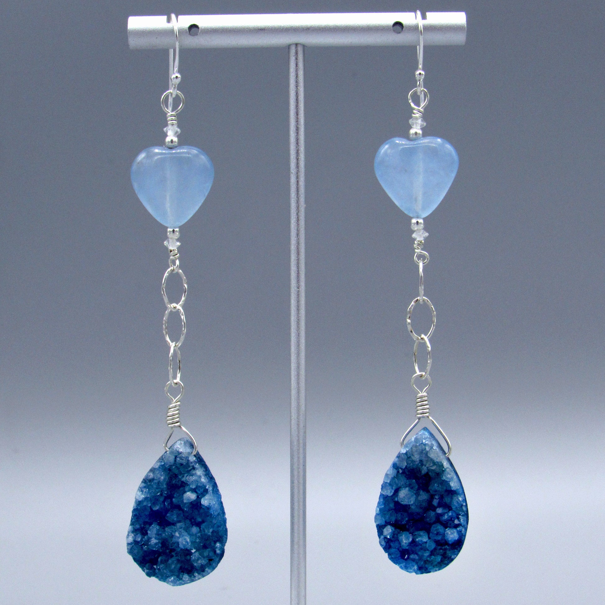 Blue Druzy Gemstone, Blue Jade Hearts, White Topaz, Sterling Silver Drop Earrings