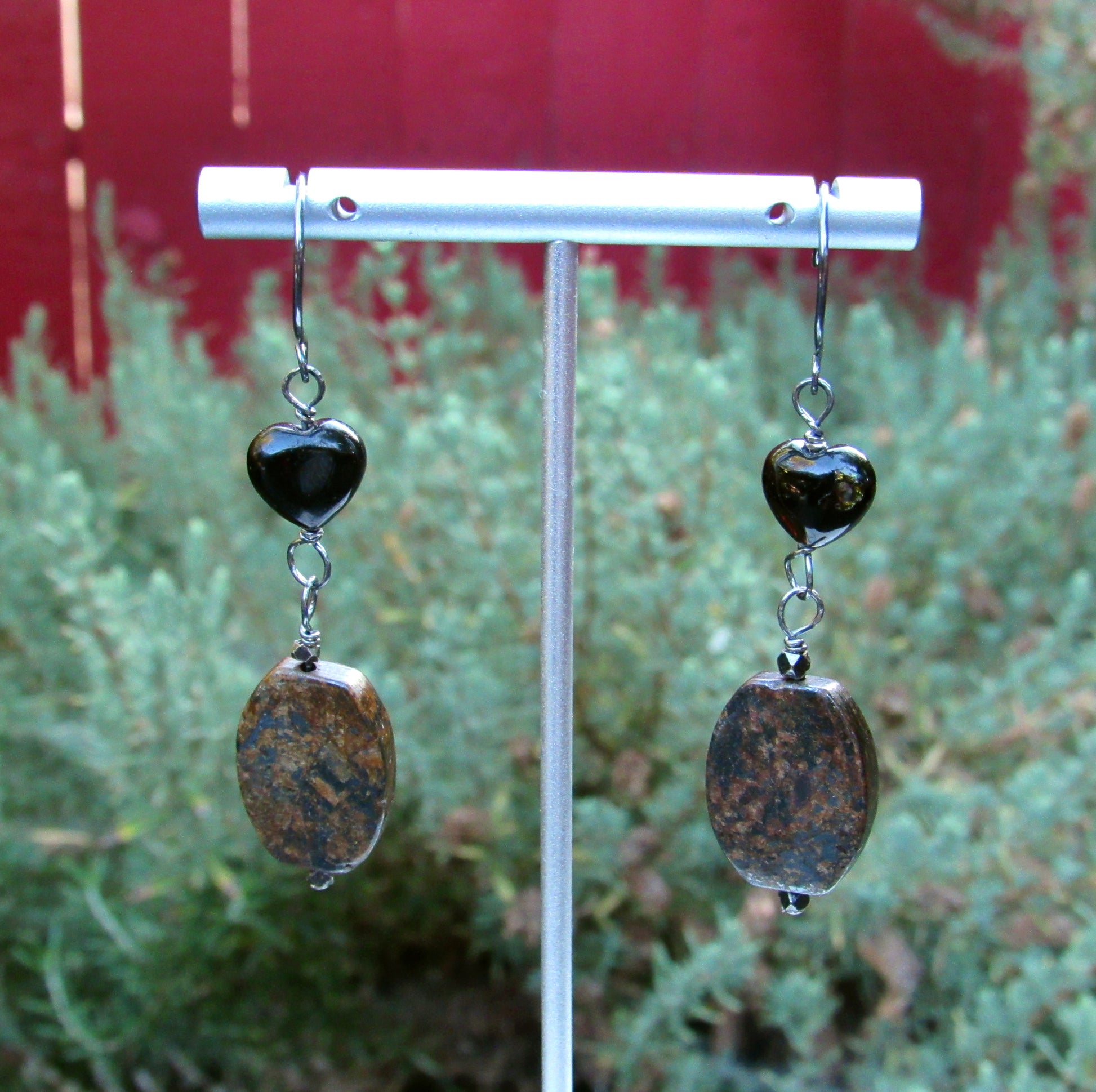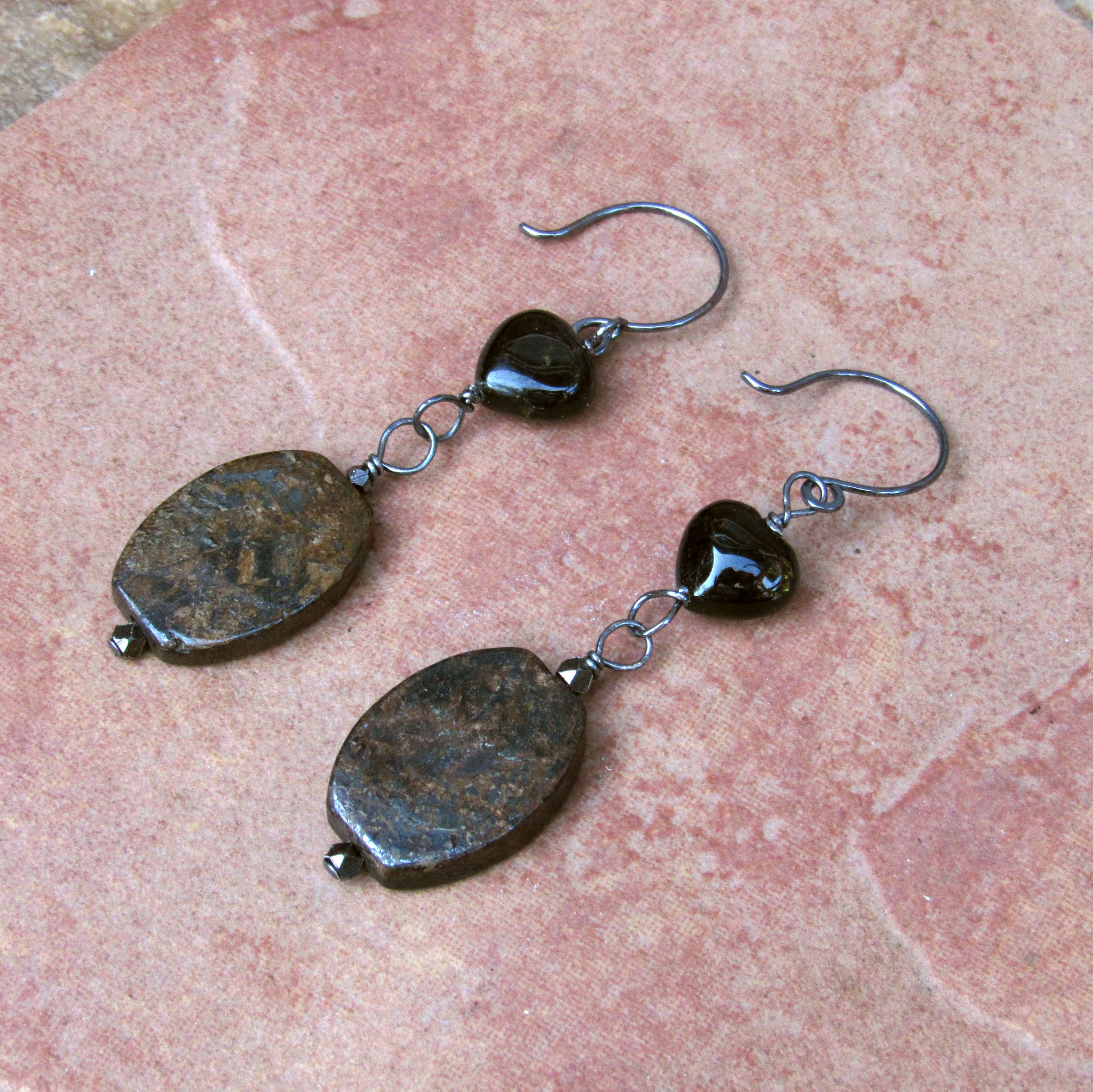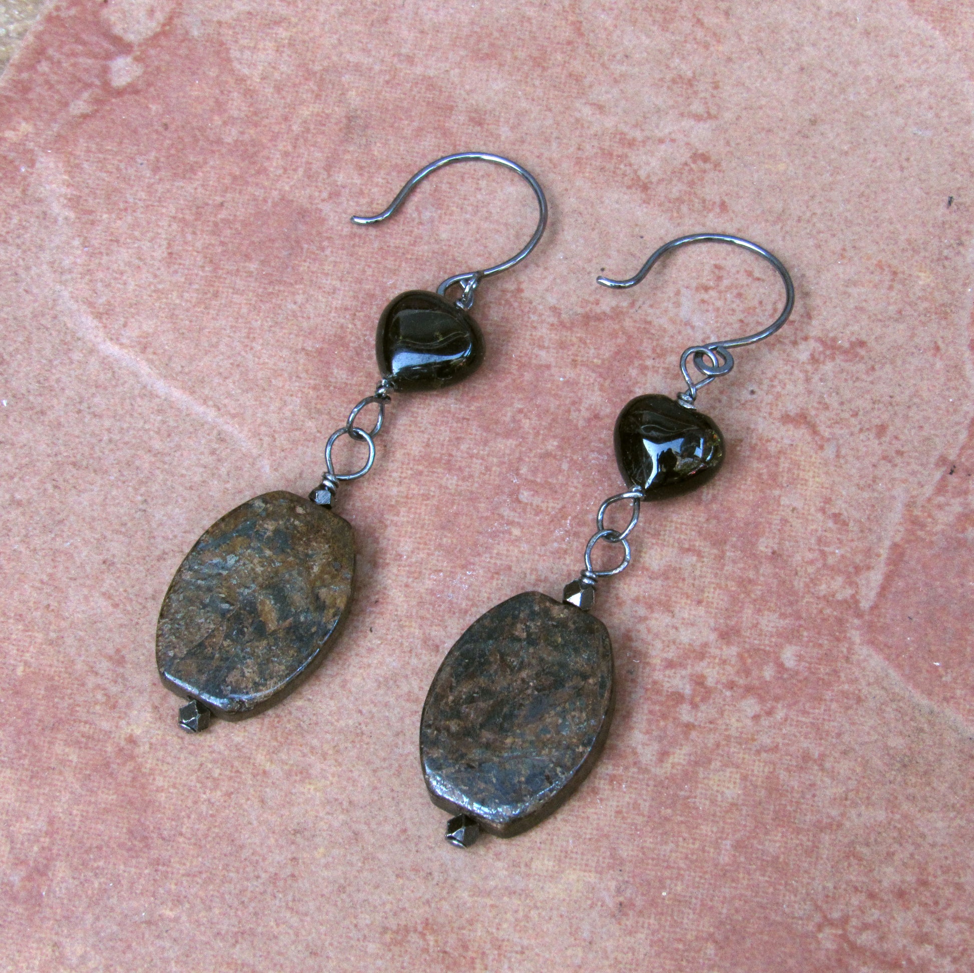 Bronzite and Heart Tourmaline w/ Oxidized Sterling Silver Drop Earrings