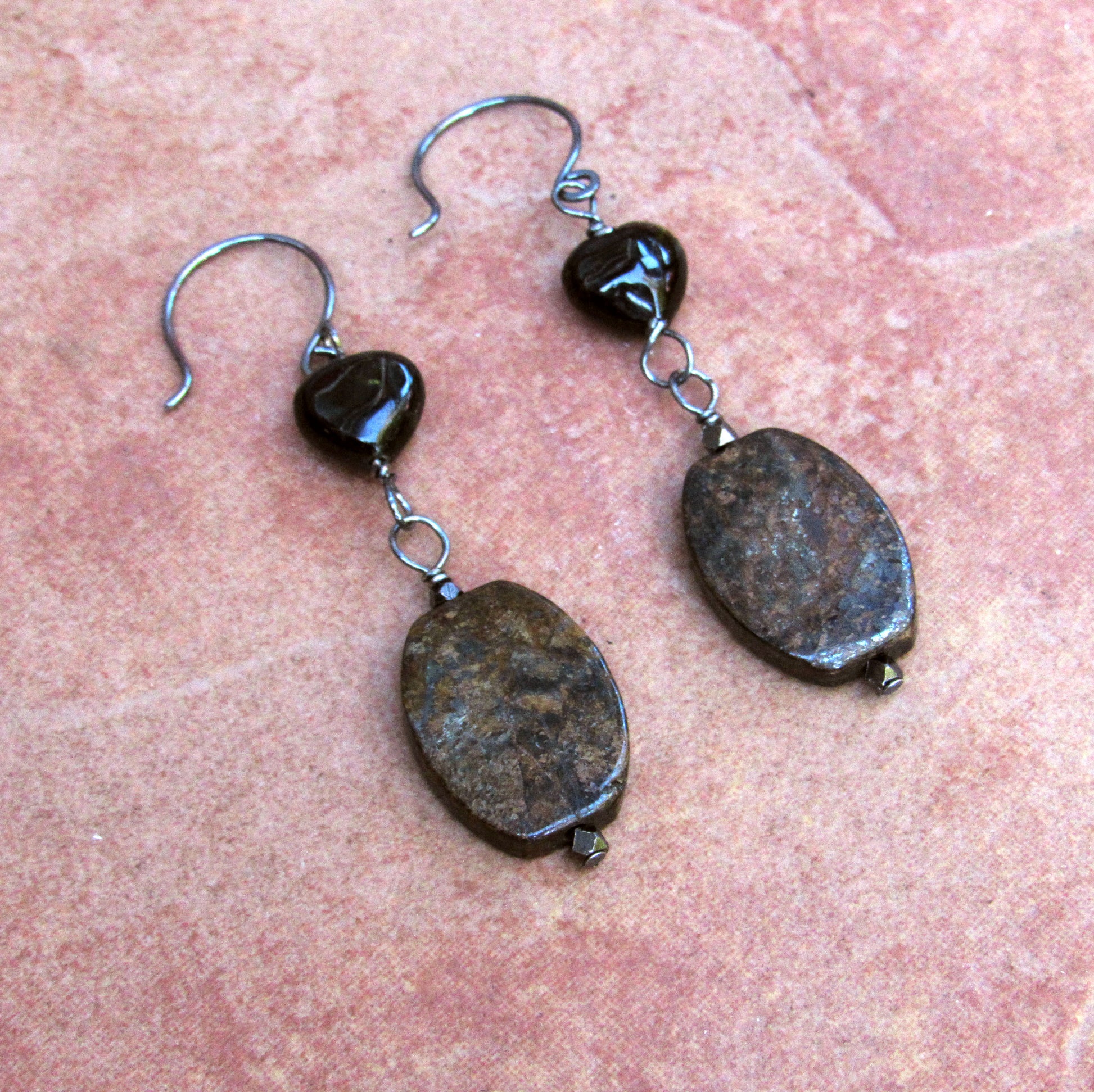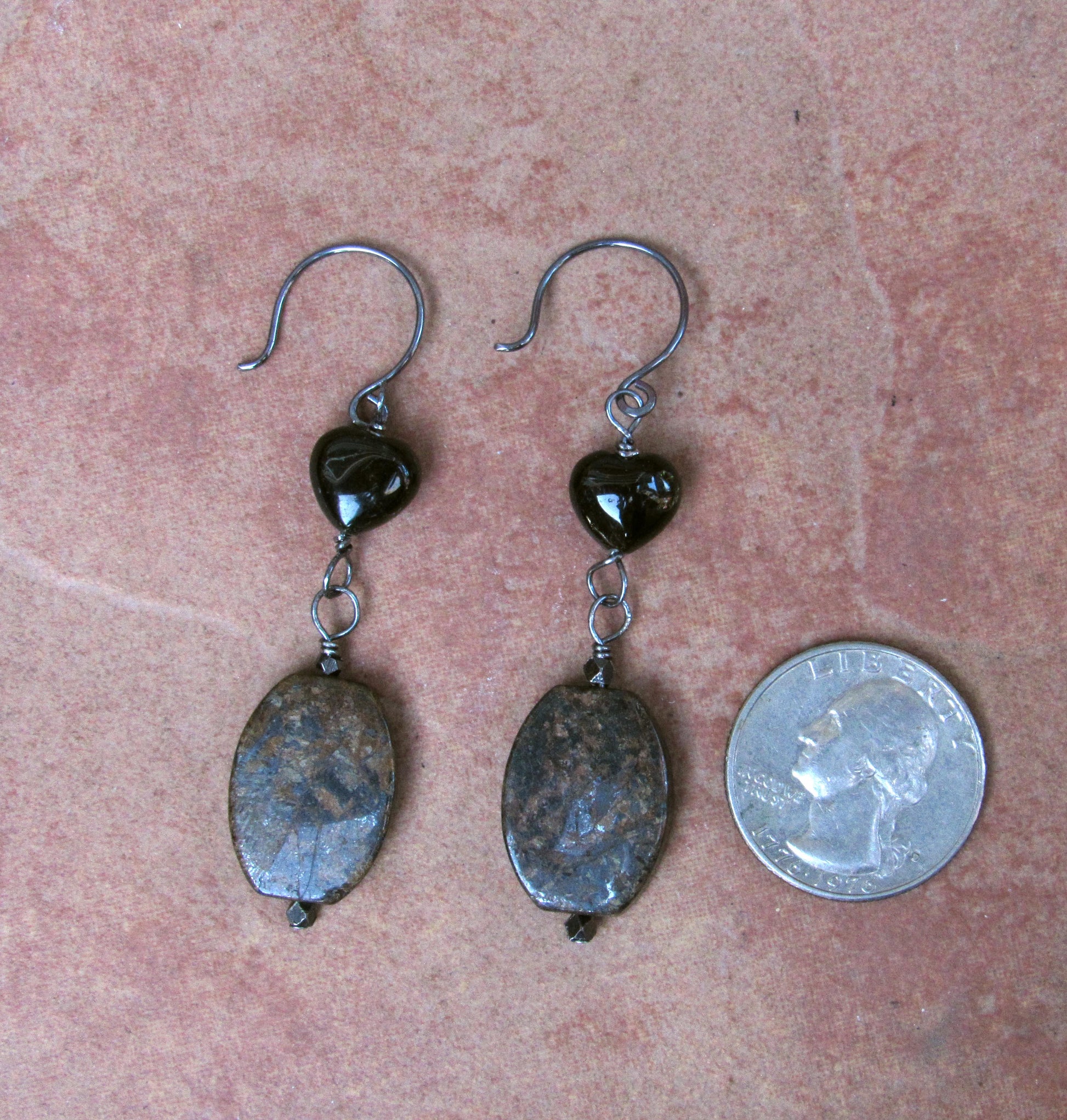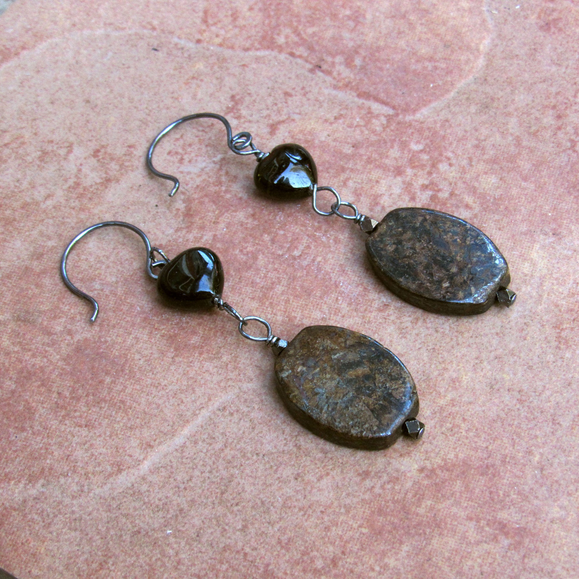 Bronzite and Heart Tourmaline w/ Oxidized Sterling Silver Drop Earrings